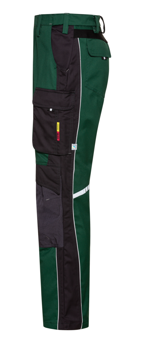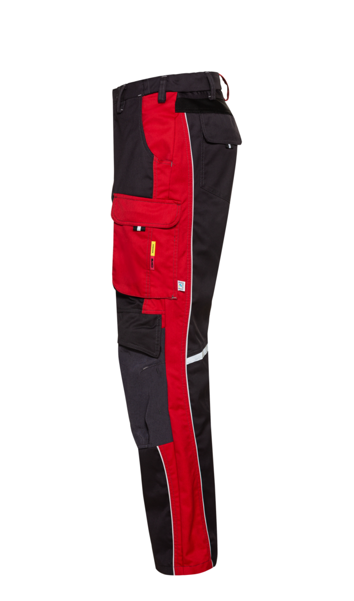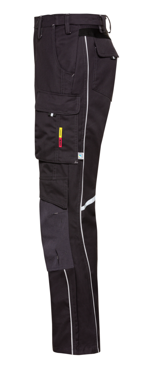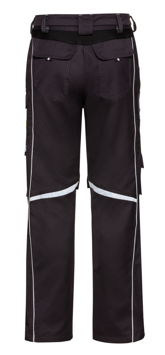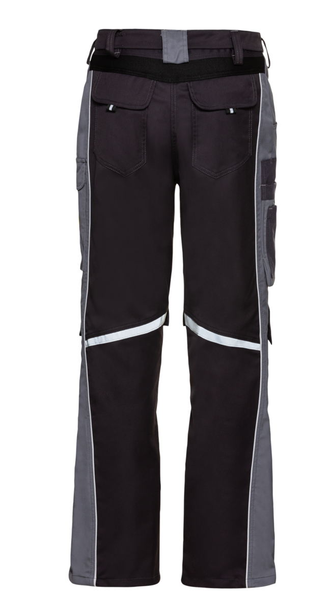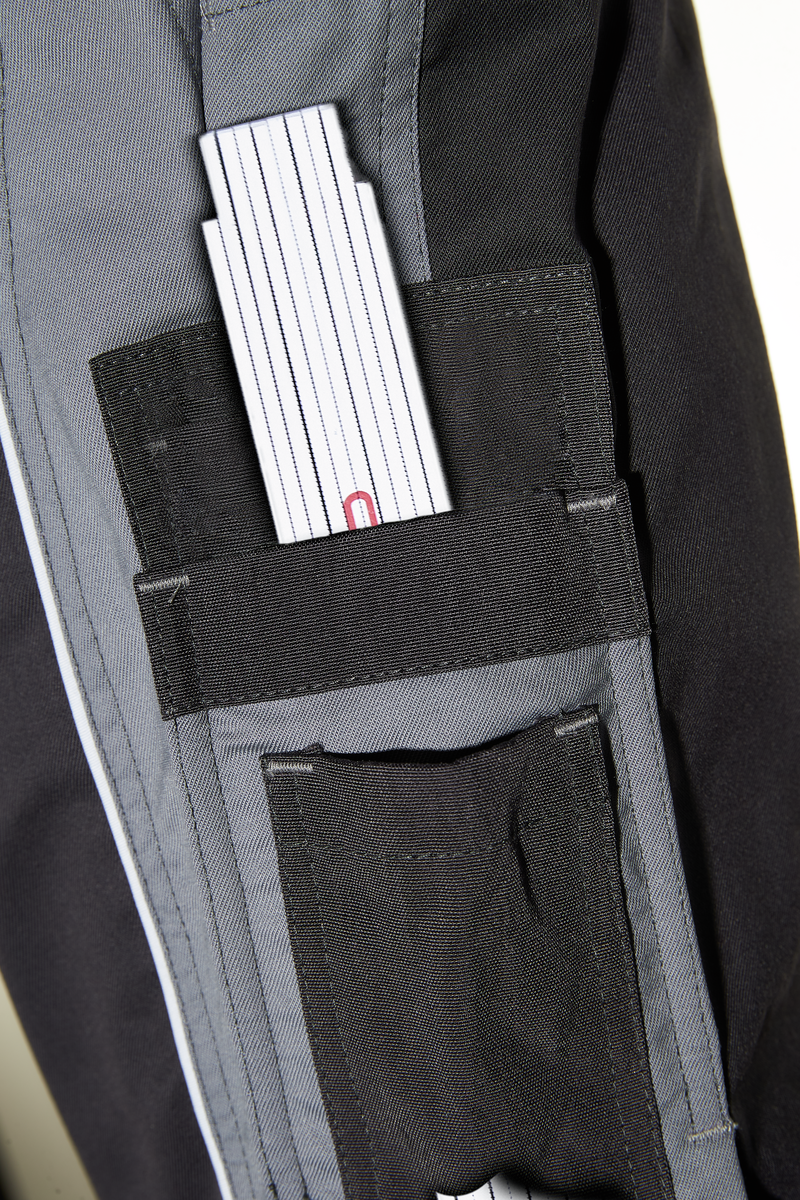 Die Bundhose aus der Kollektion „Pro Line“ verfügt trotz ihrer körpernah geschnittenen Silhouette über zahlreiche Taschen an Seiten und Gesäß, in denen Schrauben, Stifte und Werkzeug mehr als genug Platz haben. Zwei speziell aufgesetzte Taschen sind extra für Smartphone und Zollstock reserviert. Ergonomisch geformte Cordura®-Knietaschen sind mit wenigen Handgriffen von oben mit Polstern befüllbar, dadurch werden die empfindlichen Kniegelenke selbst bei Dauereinsätzen geschont. Auf der Rückseite erhöhen reflektierende Elemente die Sichtbarkeit.