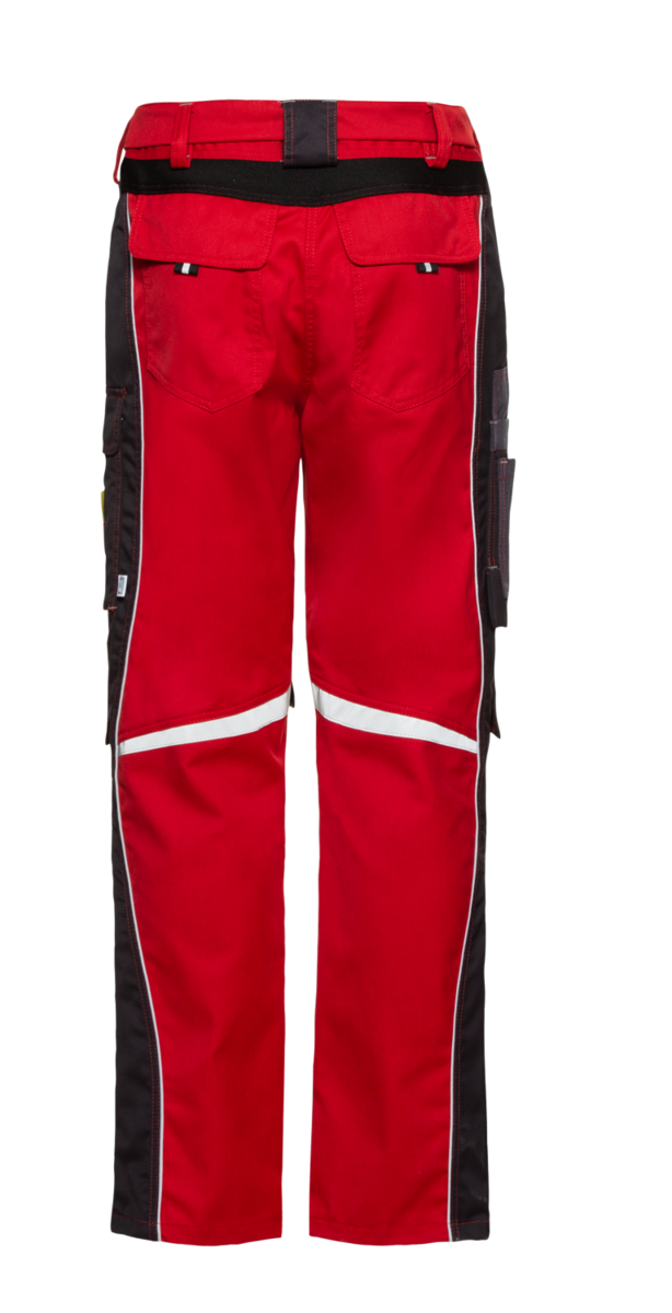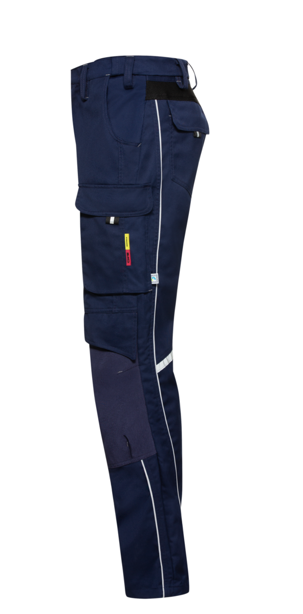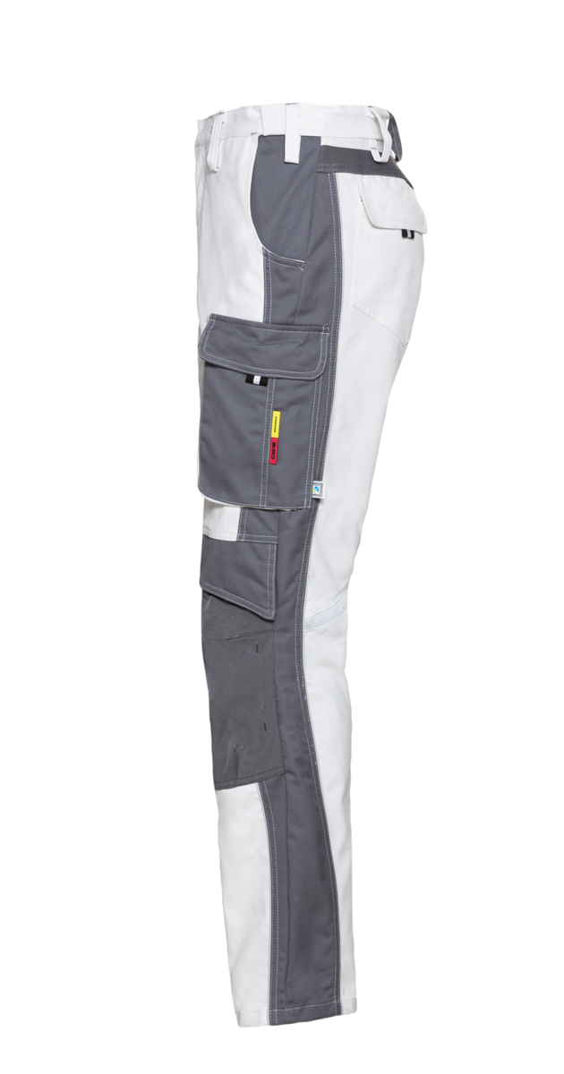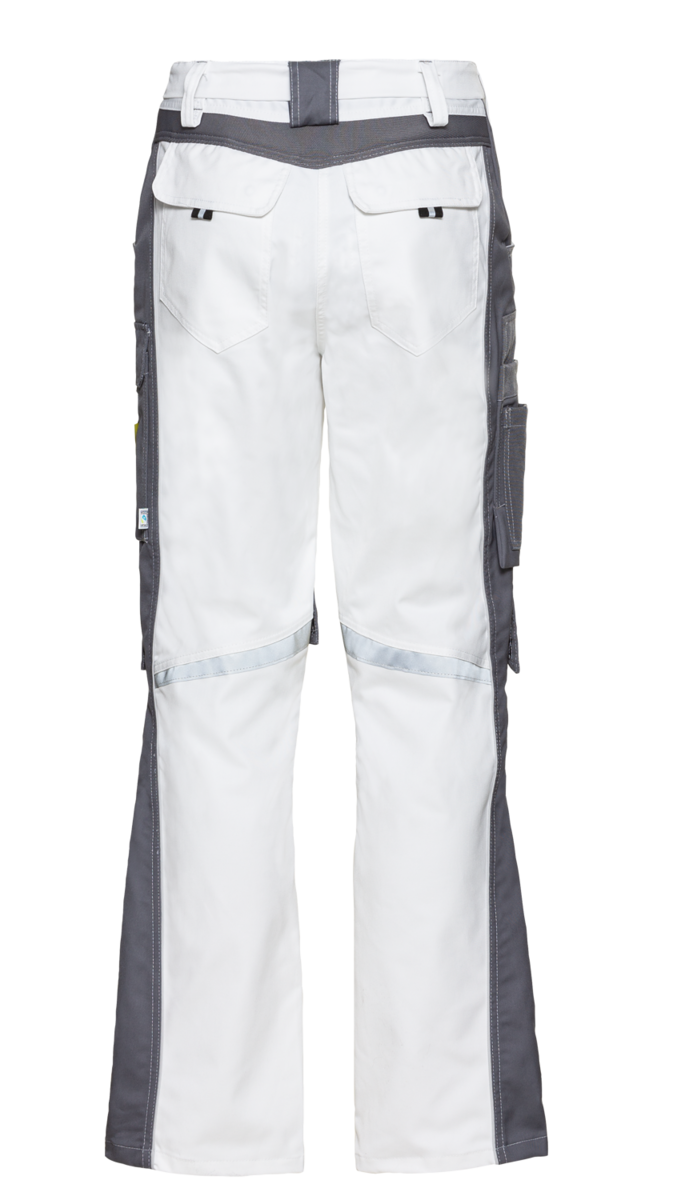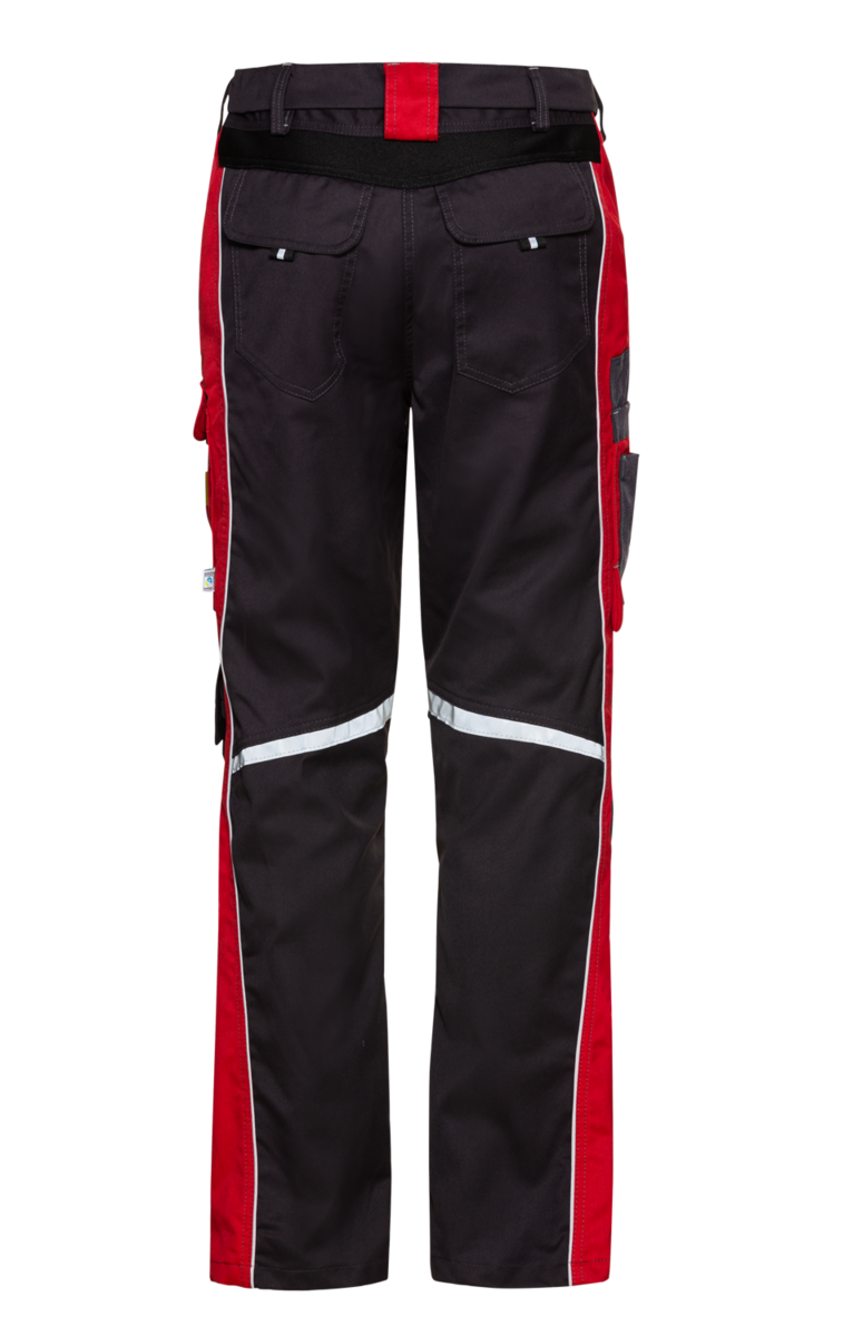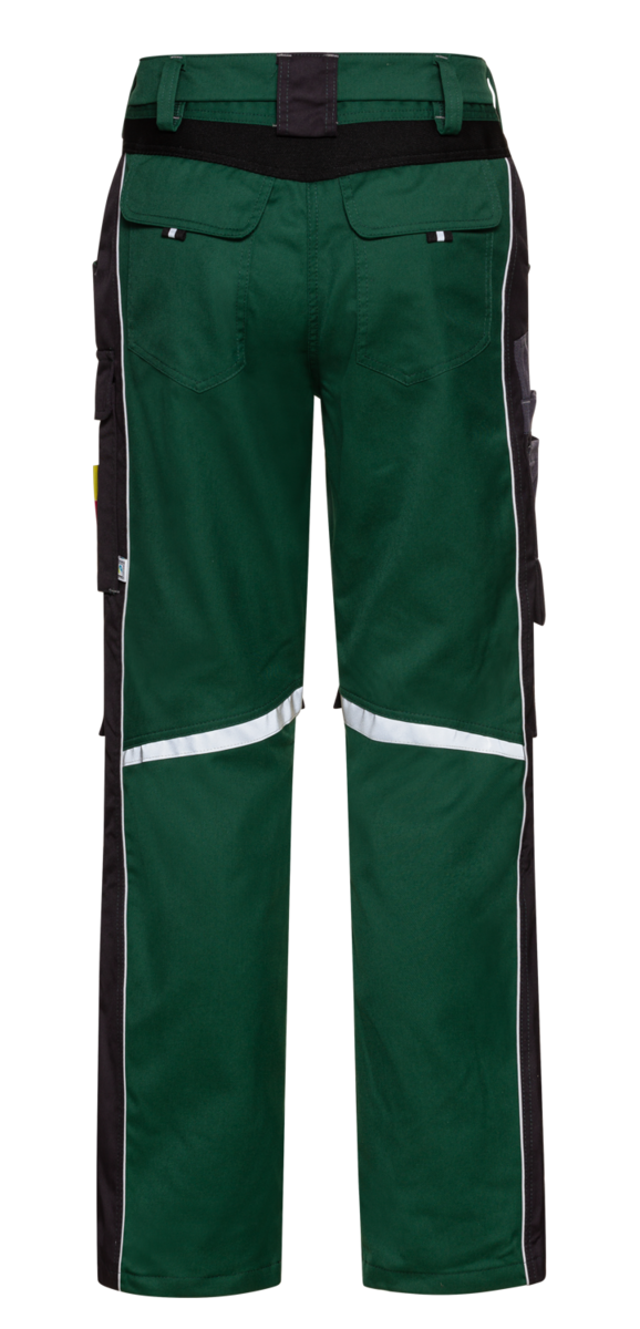 Die Bundhose aus der Kollektion „Pro Line“ verfügt trotz ihrer körpernah geschnittenen Silhouette über zahlreiche Taschen an Seiten und Gesäß, in denen Schrauben, Stifte und Werkzeug mehr als genug Platz haben. Zwei speziell aufgesetzte Taschen sind extra für Smartphone und Zollstock reserviert. Ergonomisch geformte Cordura®-Knietaschen sind mit wenigen Handgriffen von oben mit Polstern befüllbar, dadurch werden die empfindlichen Kniegelenke selbst bei Dauereinsätzen geschont. Auf der Rückseite erhöhen reflektierende Elemente die Sichtbarkeit.