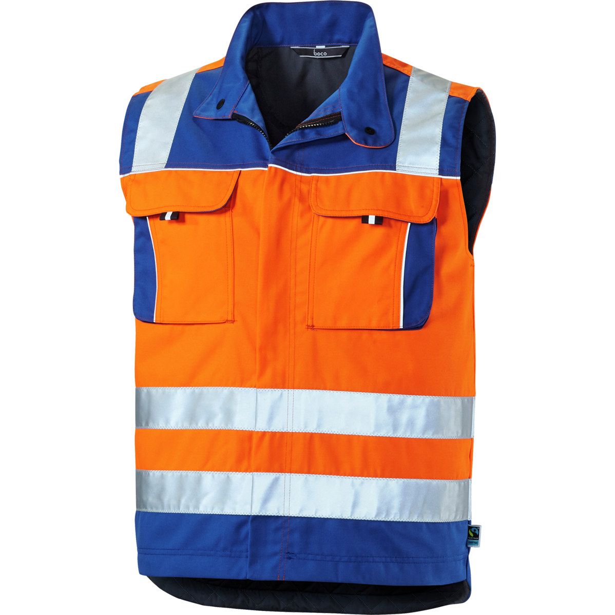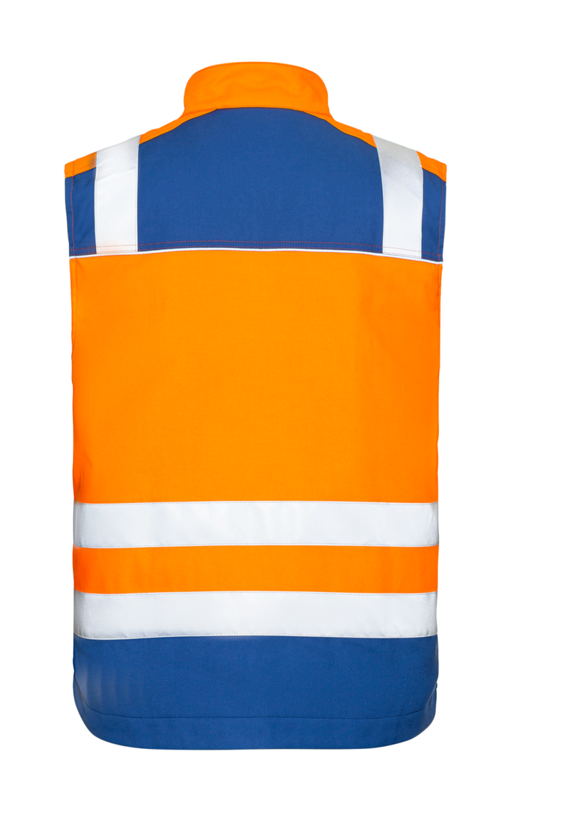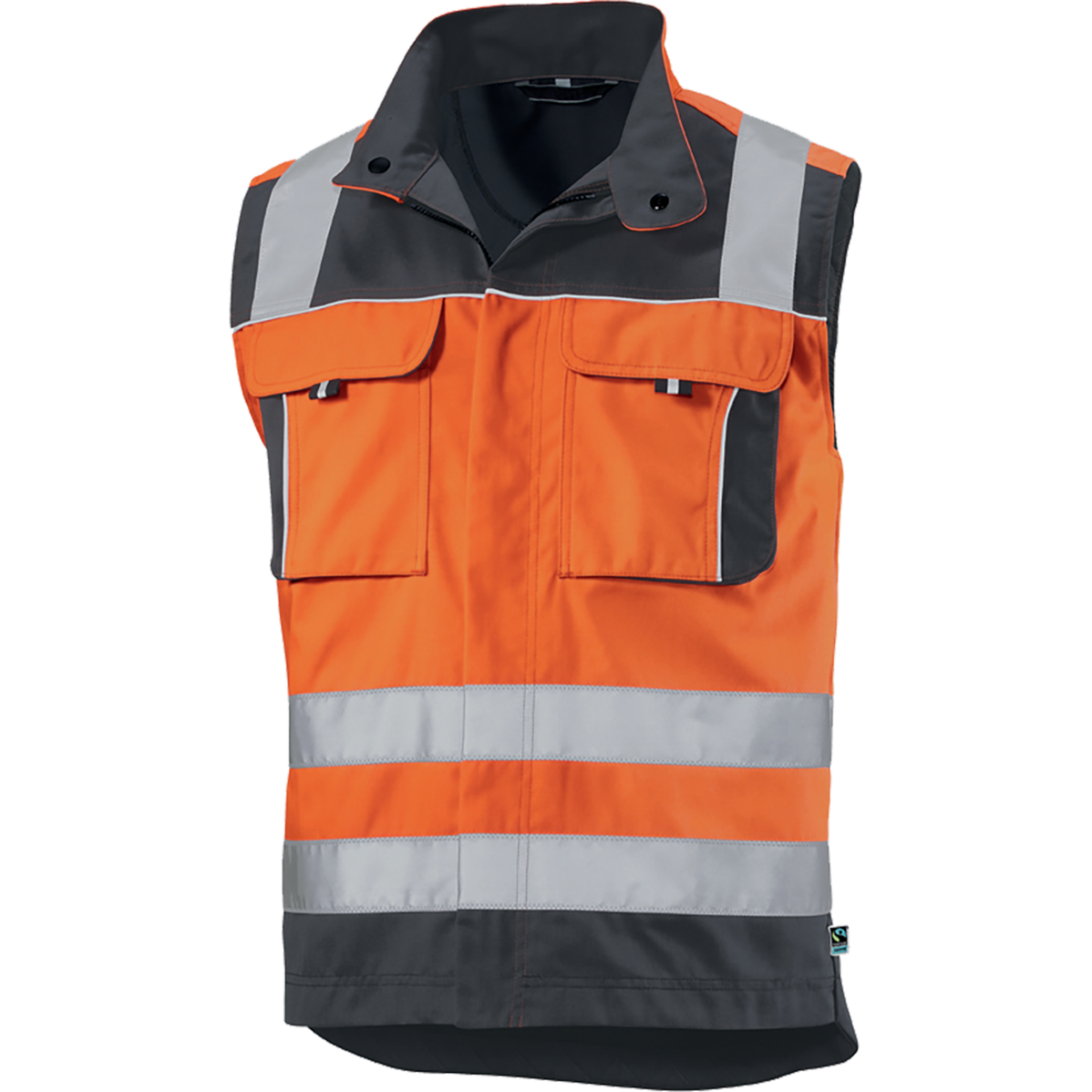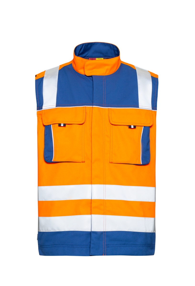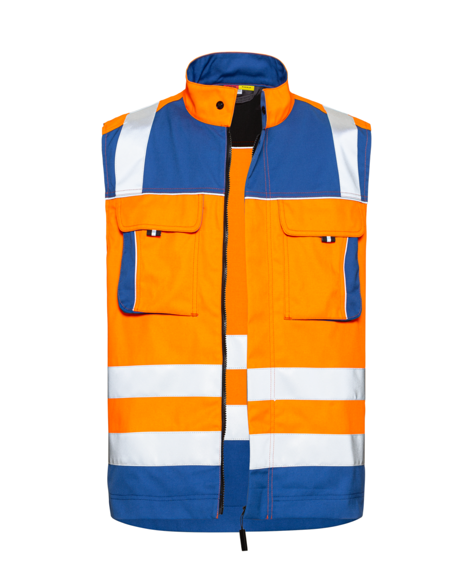 Die Weste verfügt über zwei Brusttaschen mit Druckknopf und zwei verschließbare Brustinnentaschen. Reflexstreifen im Schulter- und Rumpfbereich erhöhen die Erkennbarkeit zusätzlich. Der verlängerte Rückenteil schützt den Träger vor Zugluft.