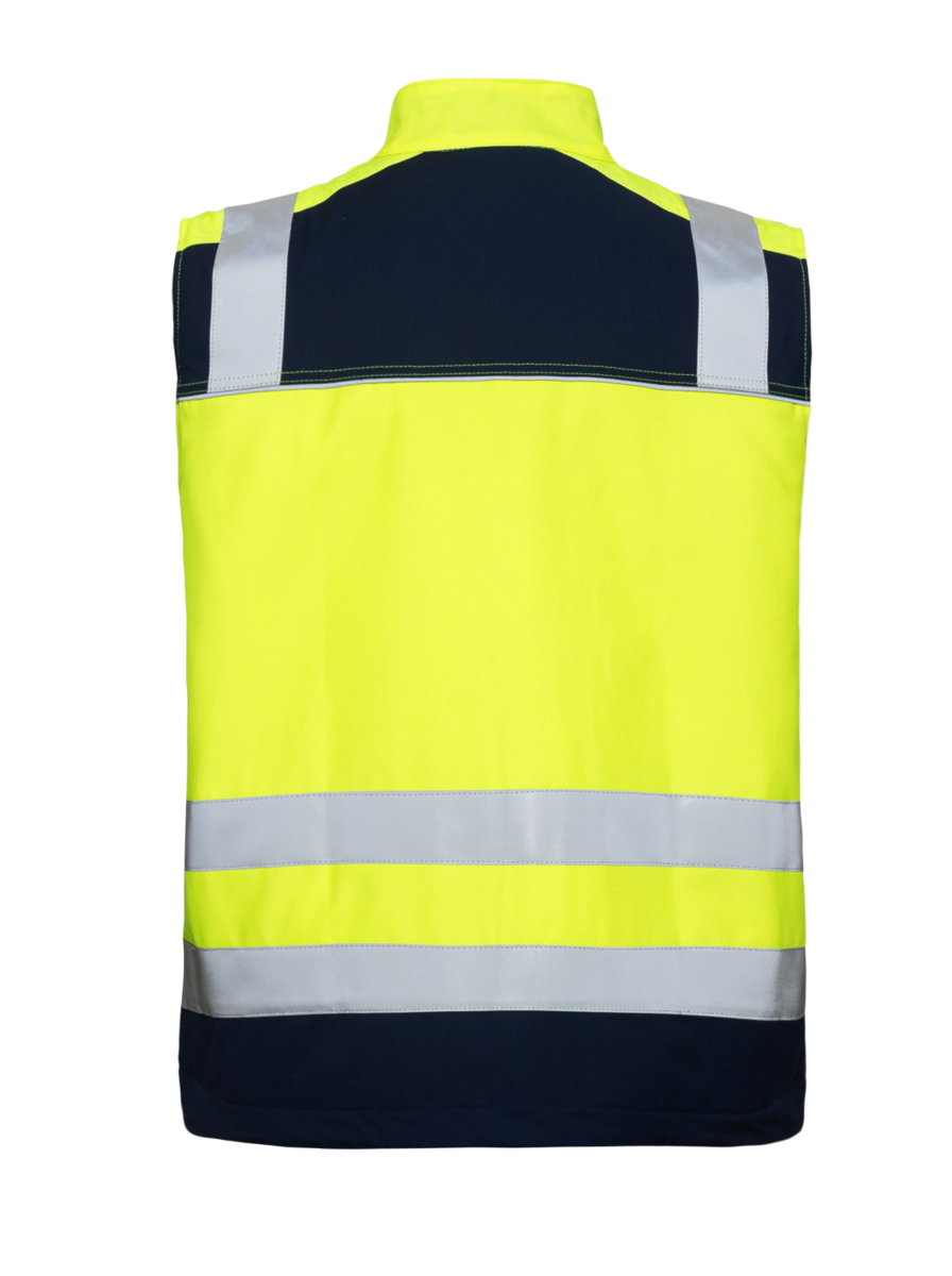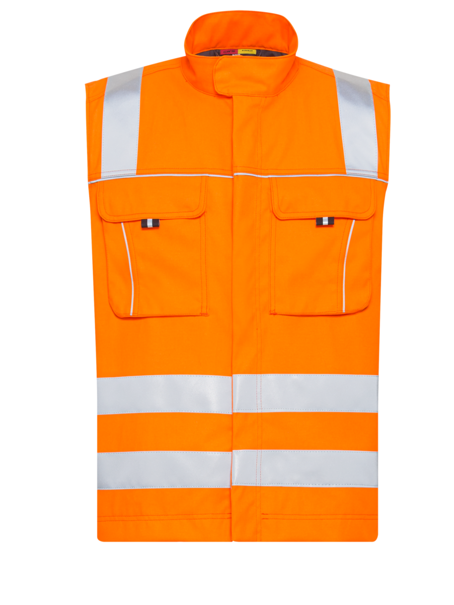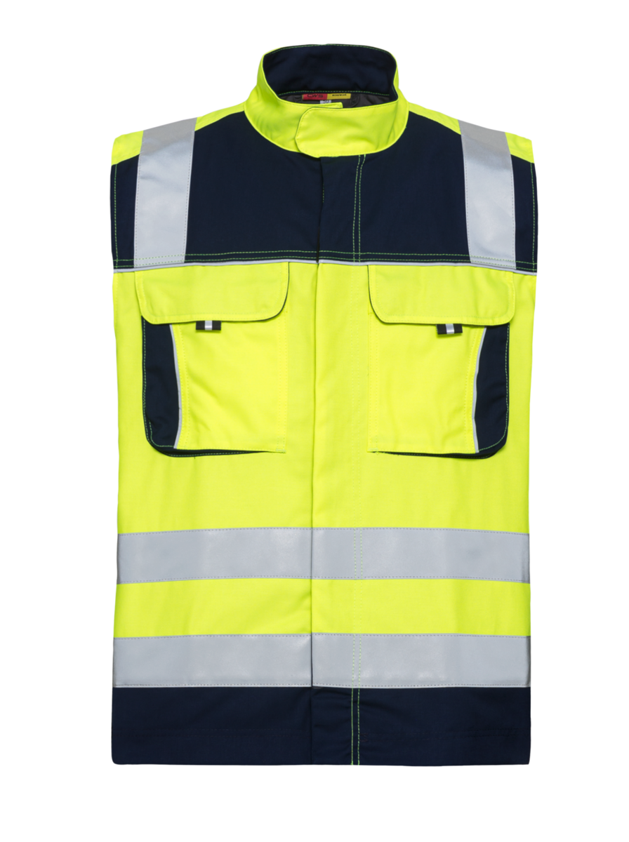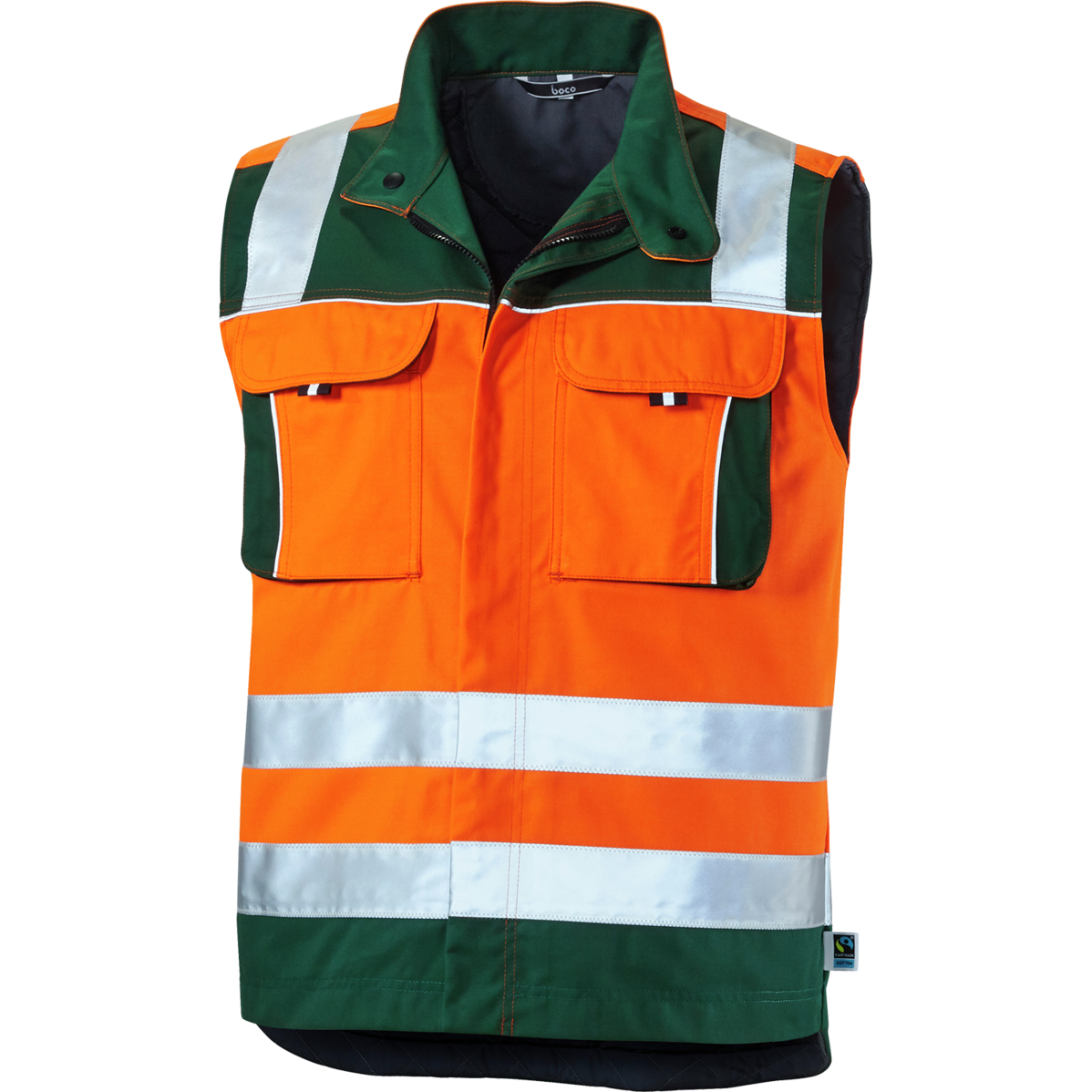 Die Weste verfügt über zwei Brusttaschen mit Druckknopf und zwei verschließbare Brustinnentaschen. Reflexstreifen im Schulter- und Rumpfbereich erhöhen die Erkennbarkeit zusätzlich. Der verlängerte Rückenteil schützt den Träger vor Zugluft.