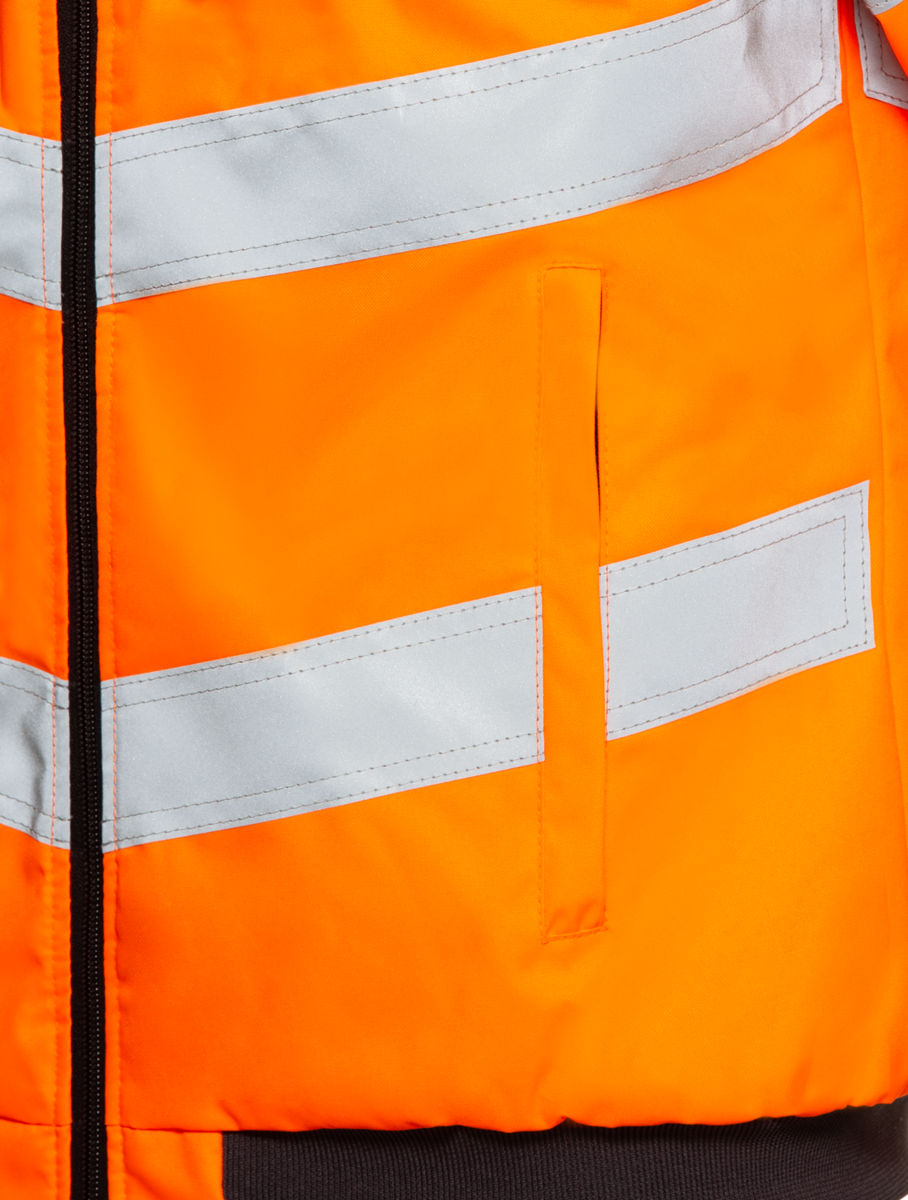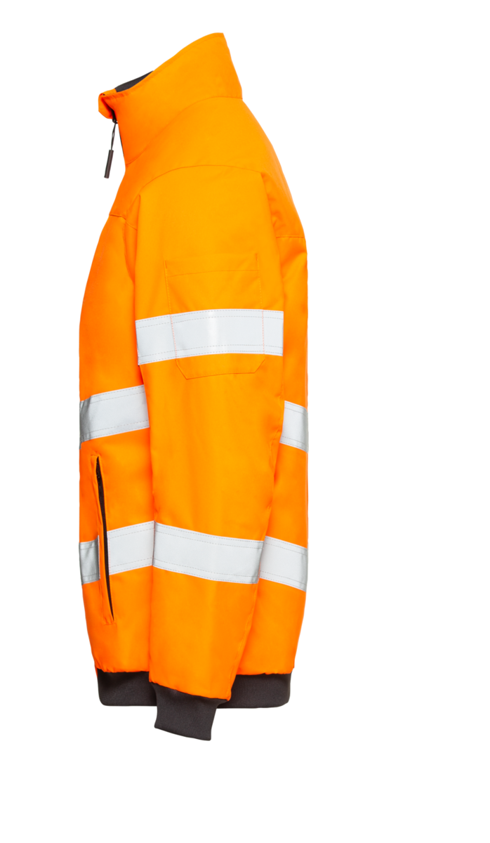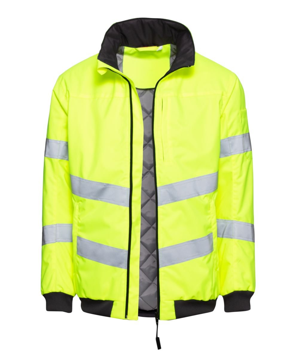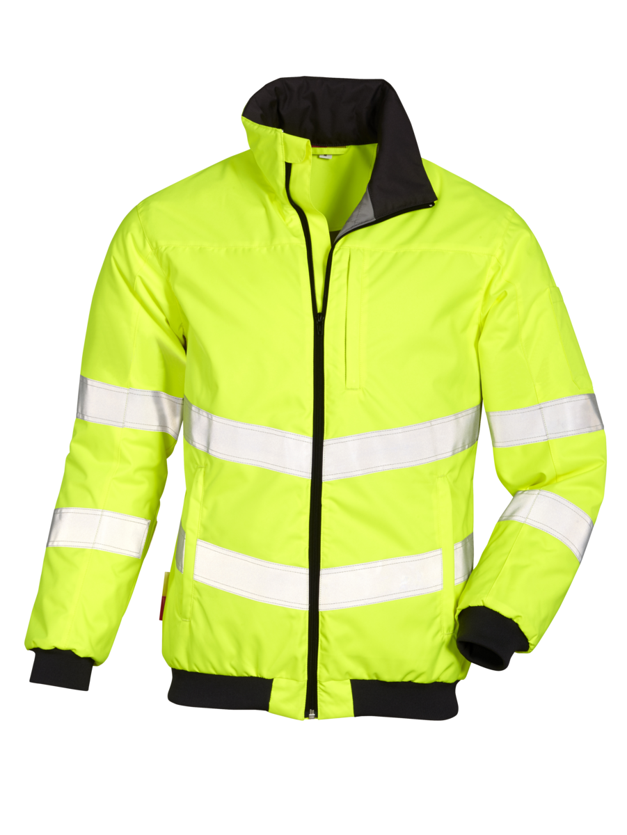 Die Pilotenjacke steht in Warngelb und Warnorange zur Wahl. Dank ihrer Fütterung hält sie Mitarbeiter auch an kühlen Tagen warm. Die enganliegenden elastischen Strickbündchen an den langen Ärmeln und der hohe Stehkragen schützen vor Zugluft und Kälte. Die Front besitzt einen Reißverschluss inklusive Kinnschutz am Kragen. Zwei seitliche plus eine Reißverschluss-Brusttasche bieten Platz für Utensilien, hinzu kommt eine Innentasche.