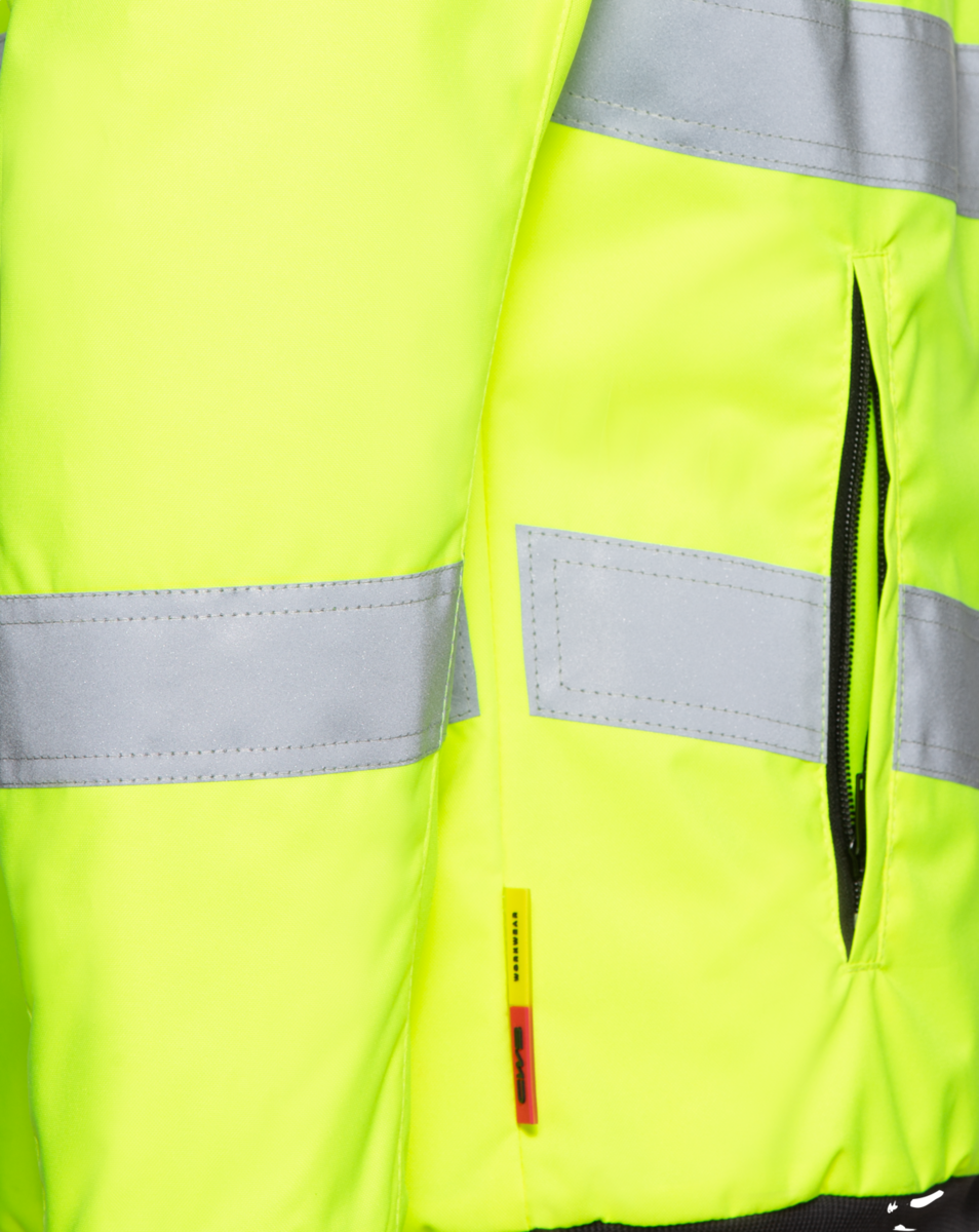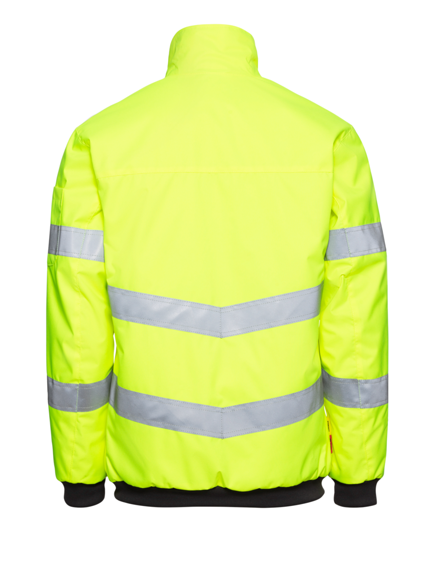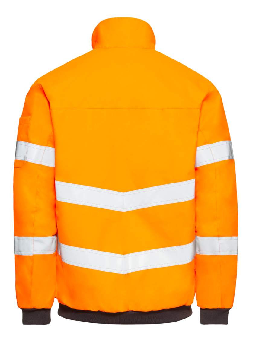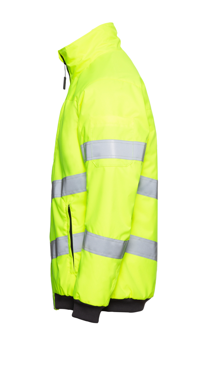 Die Pilotenjacke steht in Warngelb und Warnorange zur Wahl. Dank ihrer Fütterung hält sie Mitarbeiter auch an kühlen Tagen warm. Die enganliegenden elastischen Strickbündchen an den langen Ärmeln und der hohe Stehkragen schützen vor Zugluft und Kälte. Die Front besitzt einen Reißverschluss inklusive Kinnschutz am Kragen. Zwei seitliche plus eine Reißverschluss-Brusttasche bieten Platz für Utensilien, hinzu kommt eine Innentasche.