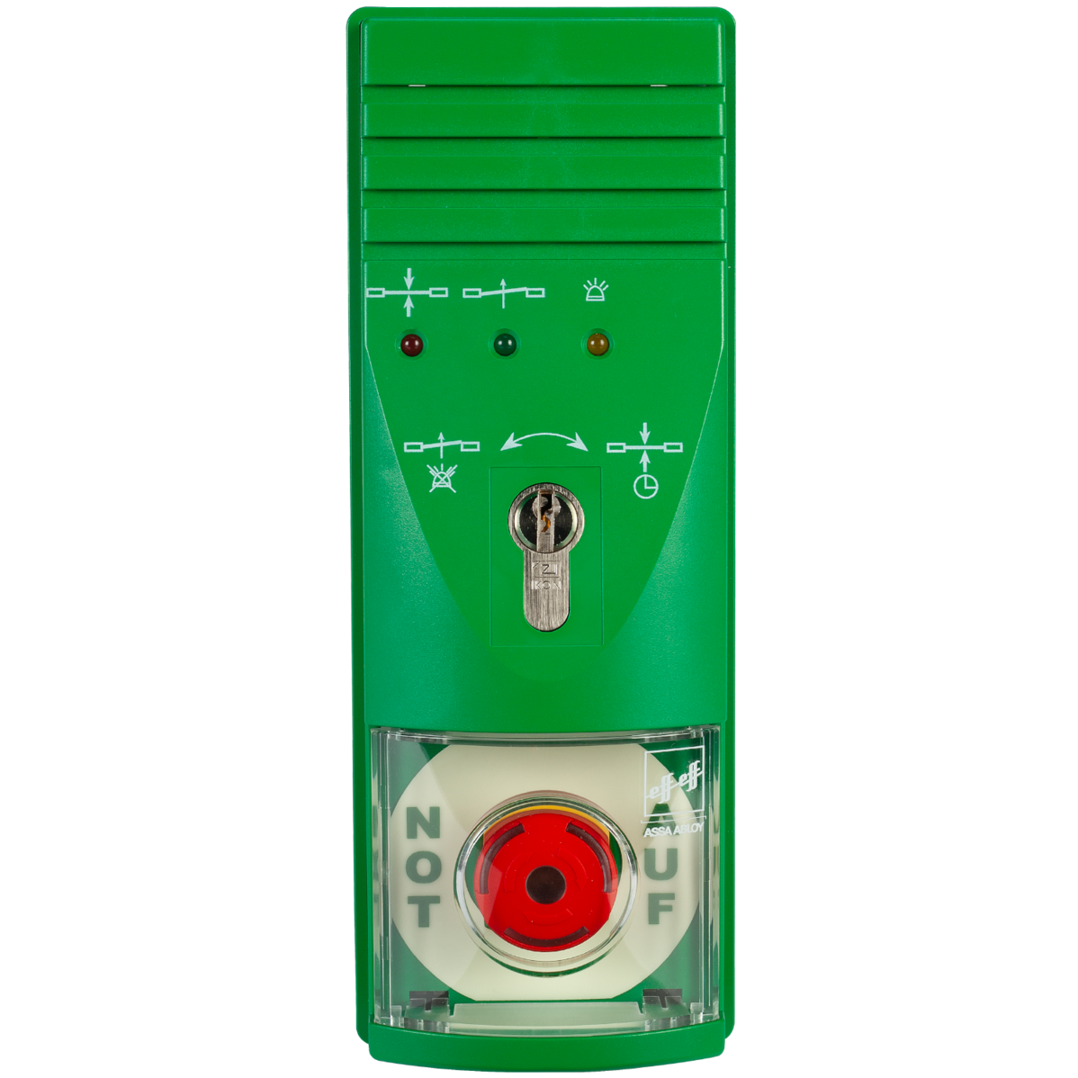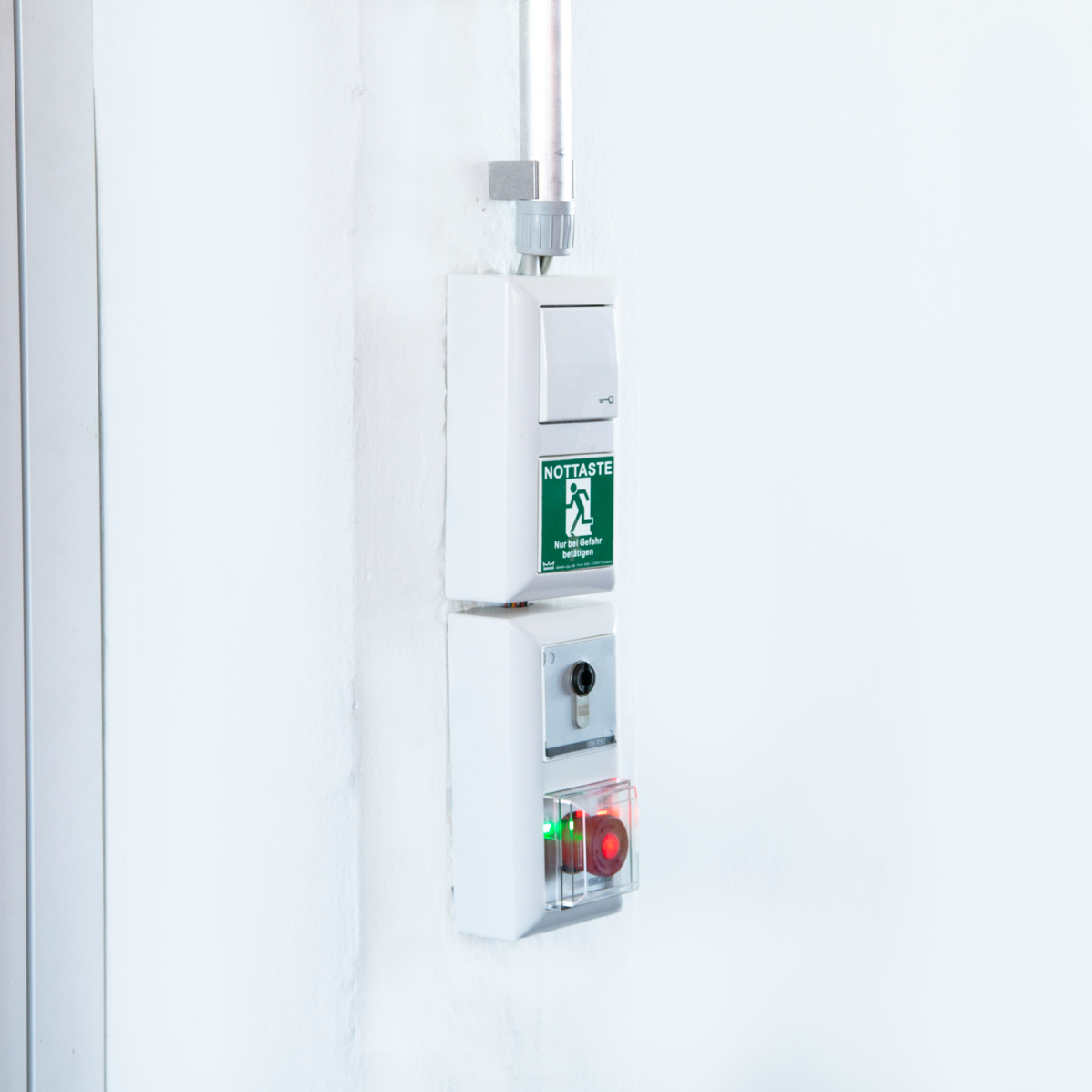 Door control units are used to secure electrically locked doors along escape and rescue routes. Thus, electrically locked escape doors can be unlocked for authorised persons during operating hours by means of an escape route terminal without triggering an alarm. In an emergency, the door can be opened by anyone by pressing the emergency button.