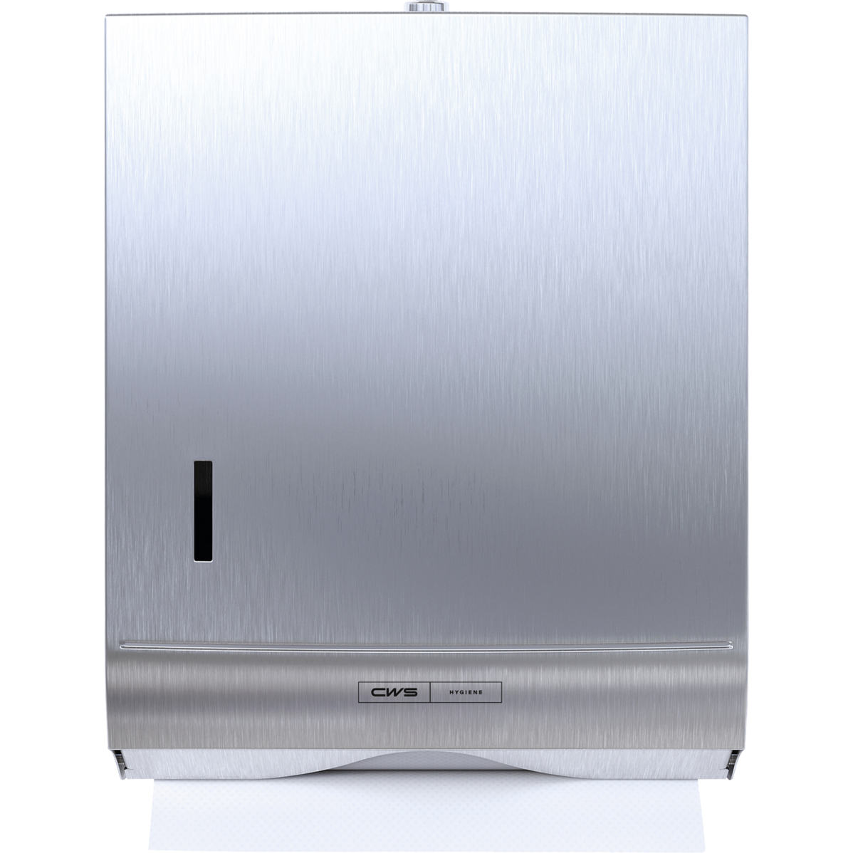 The dispenser can be filled with approx. 300 paper towels and is suitable for all common types of folded paper (including recycled, FSC, EU Ecolabel, PEFC). Opening and refilling the paper towel dispenser is very easy thanks to an intuitive locking system. The simple design fits into any washroom and can be combined with other products from the CWS Paradise Line.