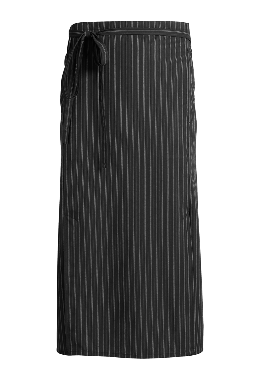 Ce tablier bistrot de couleur noire avec un fin motif à rayures combine tradition et modernité, ce qui le rend adapté à de nombreux environnements de travail dans les secteurs de la restauration, de l'hôtellerie et de la vente au détail de produits alimentaires.