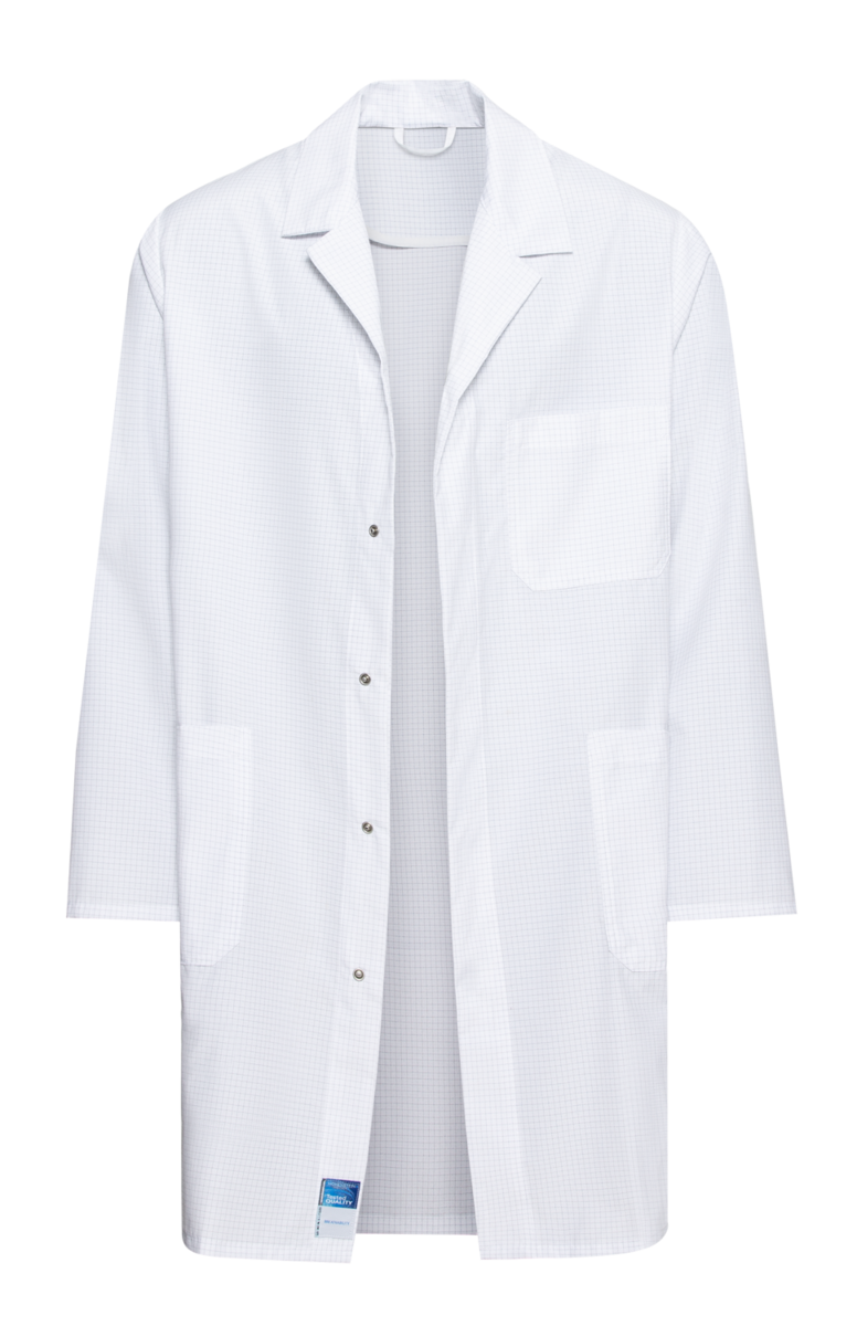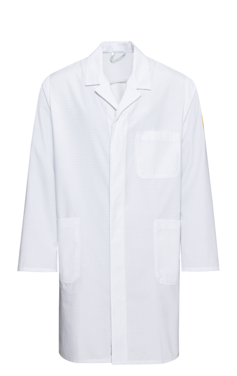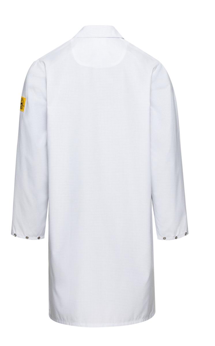 Les vêtements de travail ESD sont indispensables lorsque les employés travaillent avec des composants électroniques sensibles. Les fibres spéciales des blouses de travail, des pantalons à ceinture et des chemises de notre collection ESD Safe Line évacuent l'électricité électrostatique et empêchent ainsi que ces produits électroniques sensibles soient endommagés. Nous utilisons le tissu Conductex® avec des fibres de carbone conductrices pour garantir la protection ESD. Il est composé de 75 % de polyester, 23 % de coton et 2 % de fibres de carbone. Ce matériau est très respirant et offre un excellent confort de port grâce à son faible poids de seulement 130 g/m2. Le manteau pour homme à manches longues se marie idéalement avec les vêtements de tous les jours et est disponible en blanc, gris clair, bleu et bleu clair. Grâce à sa coupe longue, le manteau ESD est idéal pour le travail en position assise. Le devant se ferme par des boutons-pression dissimulés et les poignets des manches sont réglables. Il y a également deux poches latérales à ouverture oblique et une poche poitrine. Le logo ESD brodé sur le haut du bras indique au premier coup d'œil qu'il s'agit d'un vêtement de travail ESD.