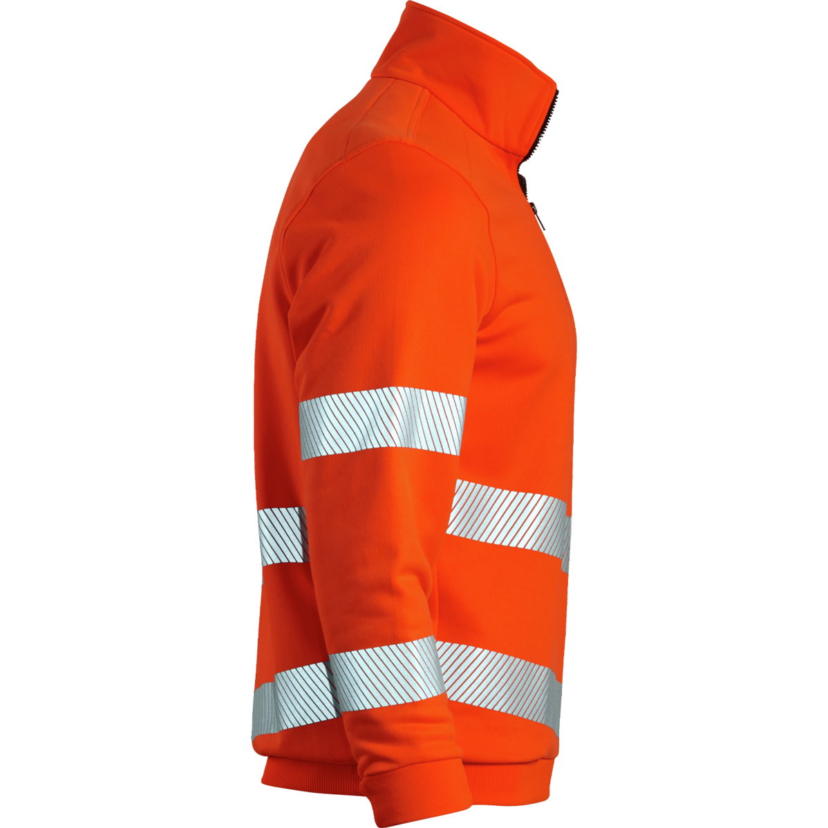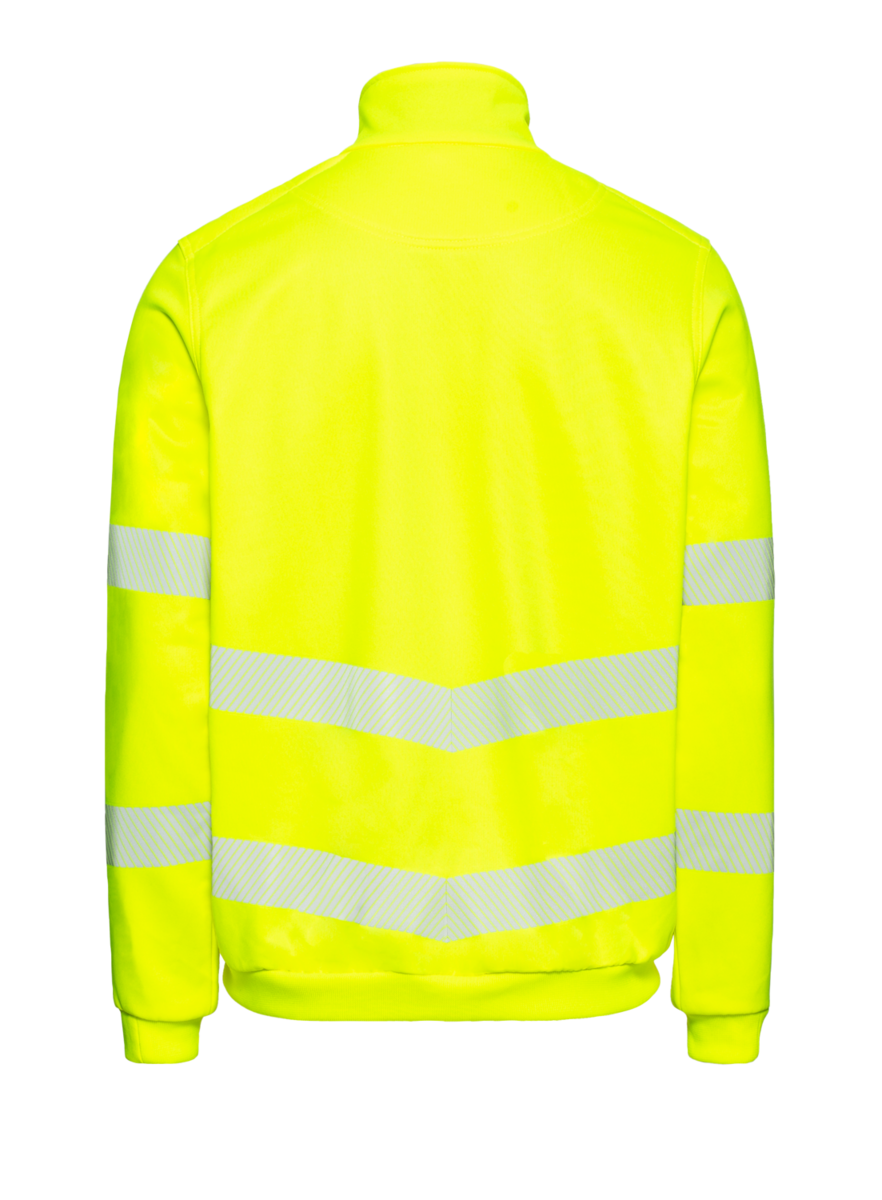 Le sweat-shirt haute visibilité présente un col montant avec une fermeture éclair de couleur contrastée. L'intérieur a été conservé en gris pour que la saleté ne se voie pas autant. Les poignets élastiques des manches s'ajustent confortablement. Le tissu renforcé des épaules fait en sorte que le sweat-shirt semble encore plus durable et se tient mieux.
