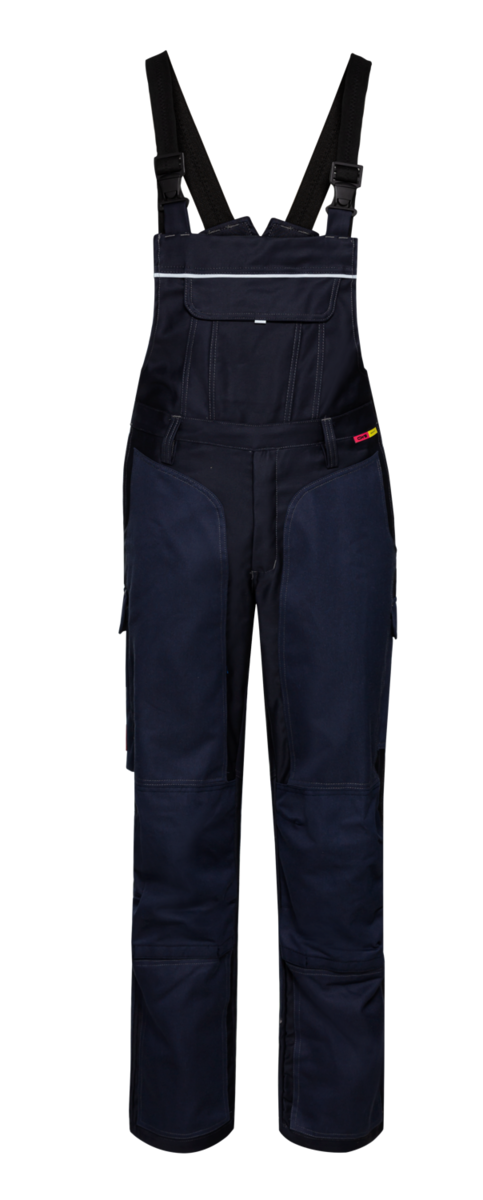 La salopette bleu foncé est dotée d'un bouton de ceinture dissimulé, de poches ergonomiques pour genouillères et de bretelles élastiques avec boucles à déclenchement rapide, sans compter les sept poches offrant un grand espace de rangement pour les outils. Le design de la ligne Pure Welding 2 se marie très bien avec les vêtements de travail proFlex4® Advanced et Metaller. Ensemble, les gammes produisent un look d'équipe uniforme. Remarque : la salopette de travail ne peut remplir sa fonction essentielle de protection que si elle est portée en combinaison avec la veste de travail correspondante.