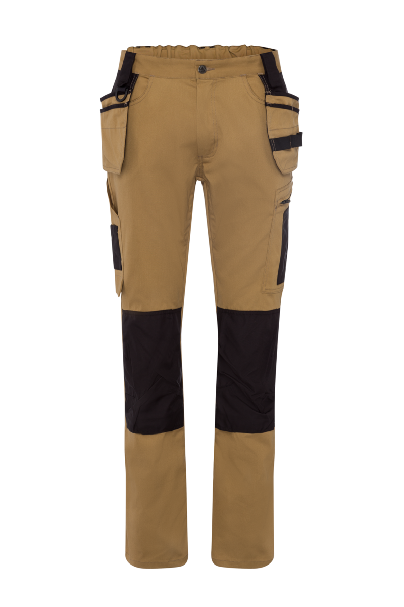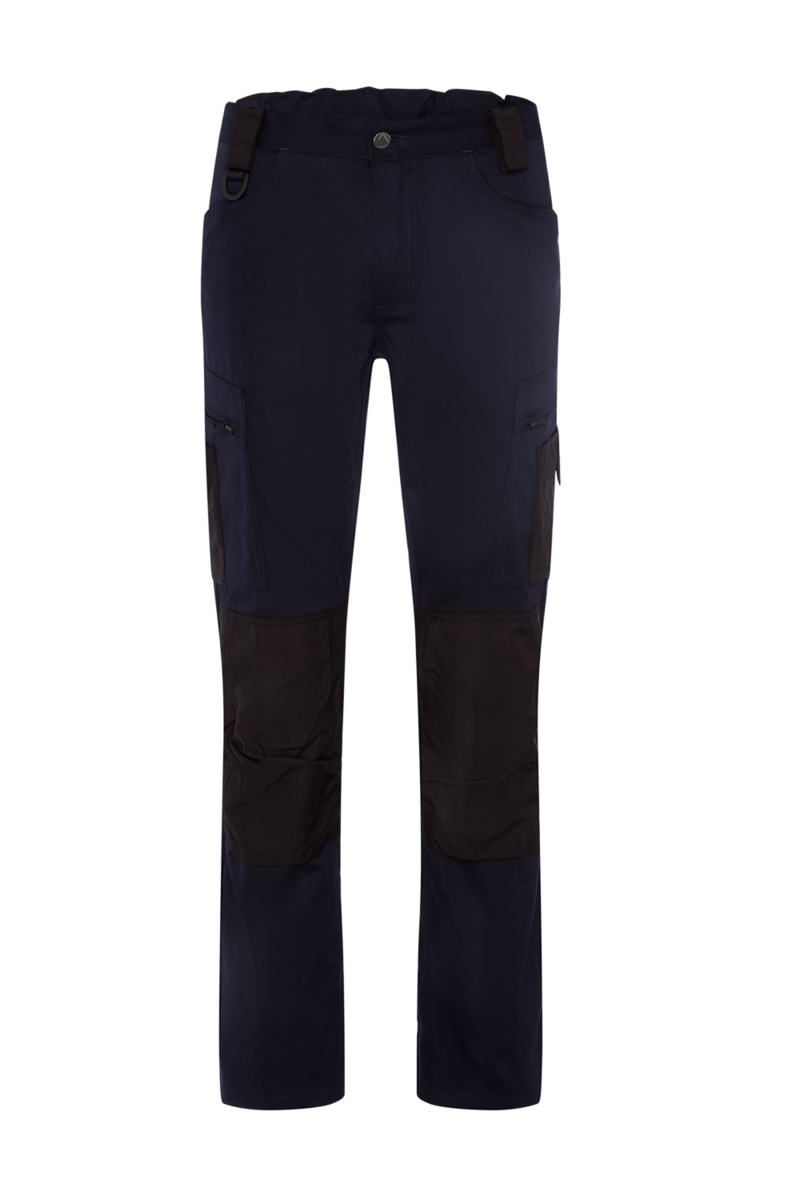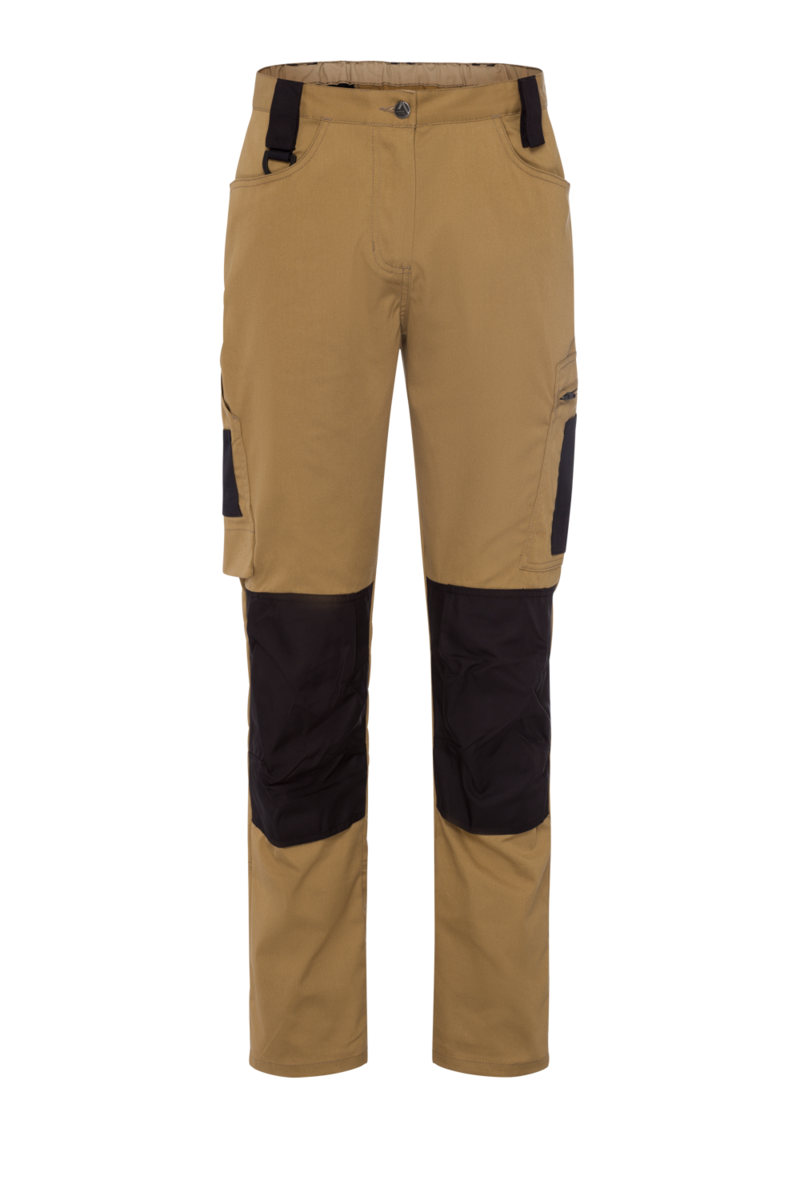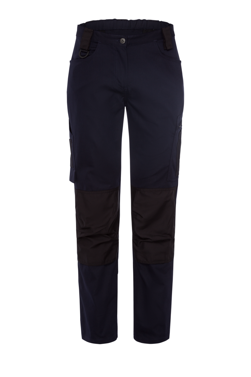 - Pantalon femme avec 5 passants de ceinture (à ouvrir avec un bouton-pression) partie arrière avec bande élastique