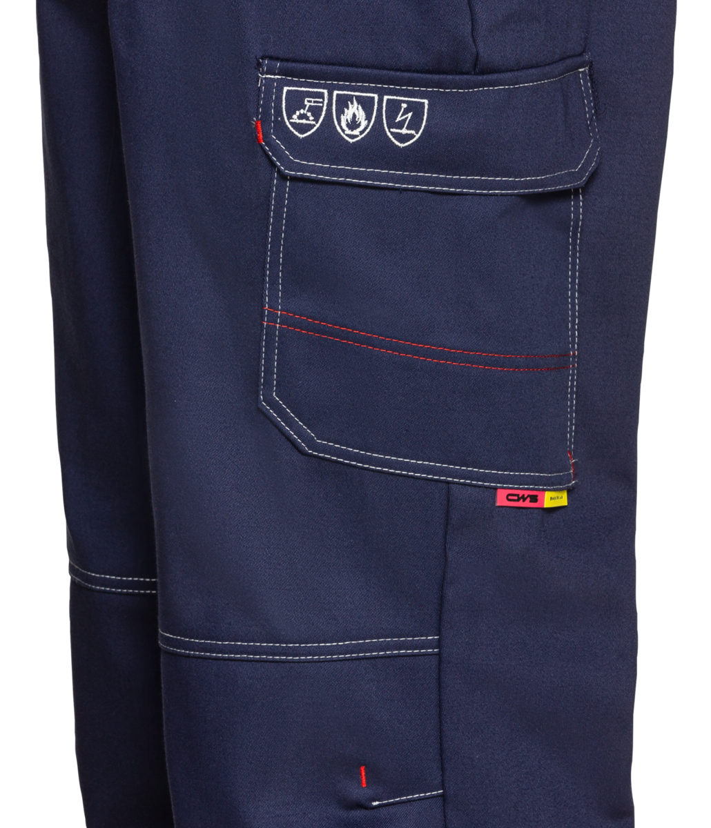 - Poches latérales, une poche bavette, une poche arrière à droite, une poche soufflet renforcée avec compartiment pour règle pliante à droite et une poche soufflet renforcée pour la jambe à gauche (toutes les poches plaquées avec rabats et boutons-pression) .