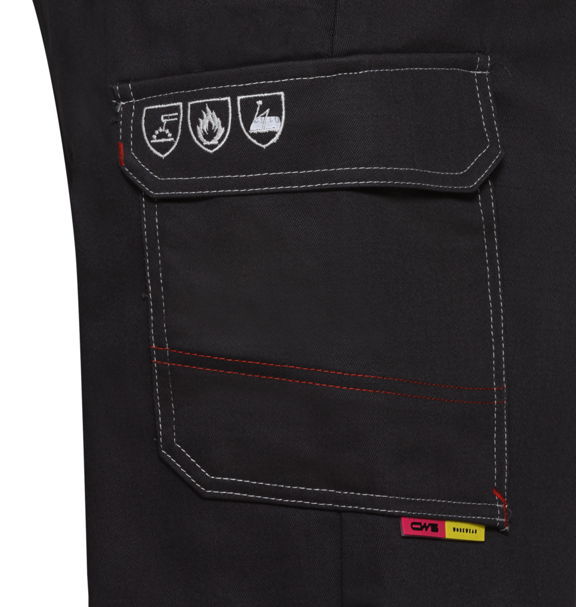 - Pictogrammes standards sur la poche de la jambe gauche, bande réfléchissante autour des jambes à hauteur du mollet .