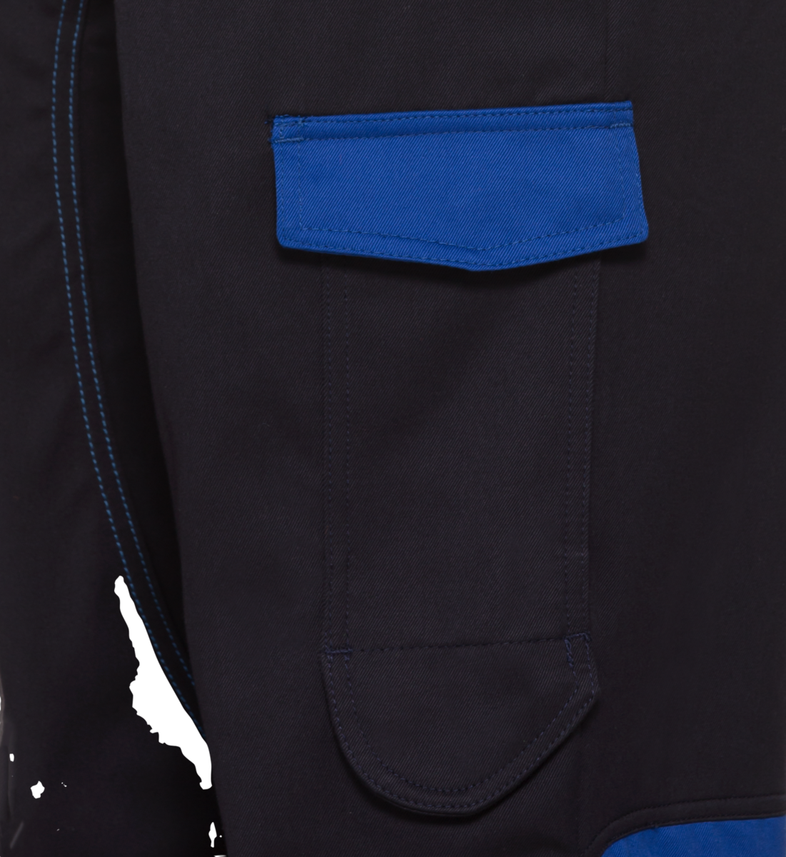 - Deux poches latérales, une poche arrière avec rabat et bouton pression, une poche bavette, une poche mètre pliant à droite et une poche jambe à gauche comprenant une poche pour smartphone et stylo (toutes les poches plaquées avec rabat et boutons pression)