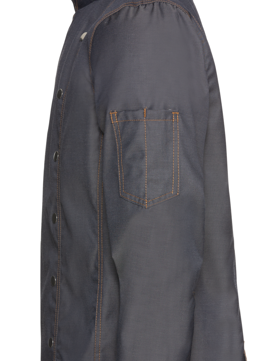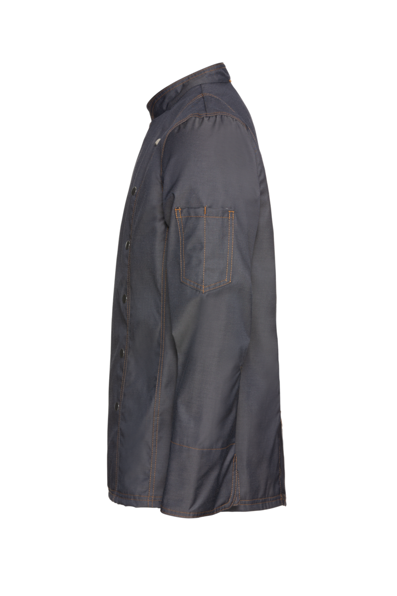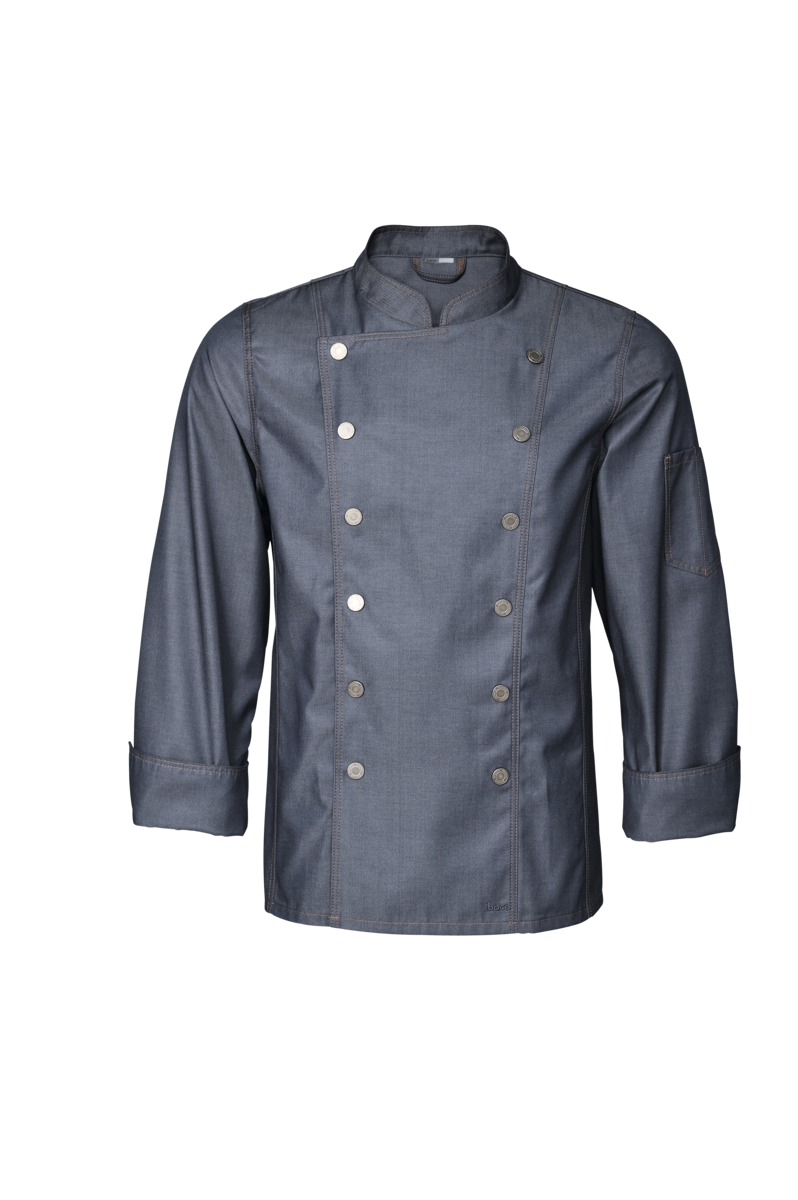 Ez a hosszúärmelige szakácskabát „Boston Line“ trendtudatosan farmeres megjelenésben mutatja meg magát. Ideális kreatív és fiatalos vendéglátóipari koncepciókhoz, például food truckokhoz vagy BBQ éttermekhez, valamint trendi szállodákhoz és modern kiskereskedelmi üzletekhez. A denimet magas viselési kényelem és robusztus ellenálló képesség jellemzi. Ügyfelei imádni fogják a lélegző, bőrbarát és könnyű anyagminőséget. Ennek a szakácskabátnak a hosszú ujjai megvédik az alkarokat a gőz, a főzőlapon uralkodó magas hőmérséklet és a fröccsenő folyadékok ellen. A szakácskabátot dupla sor nyomógombokkal lehet rögzíteni; a nyomógomboknak köszönhetően gyorsan felvehető, vészhelyzetben pedig gyorsan levehető. A magas pamuttartalomnak köszönhetően a séfkabát kellemes érzést nyújt a bőrön; a poliészter tartalom a napi tisztítás mellett is kiváló alaktartást biztosít. A férfi szakácskabát a bal karon tolltartó zsebbel, klasszikus állógallérral és széles mandzsettával rendelkezik.