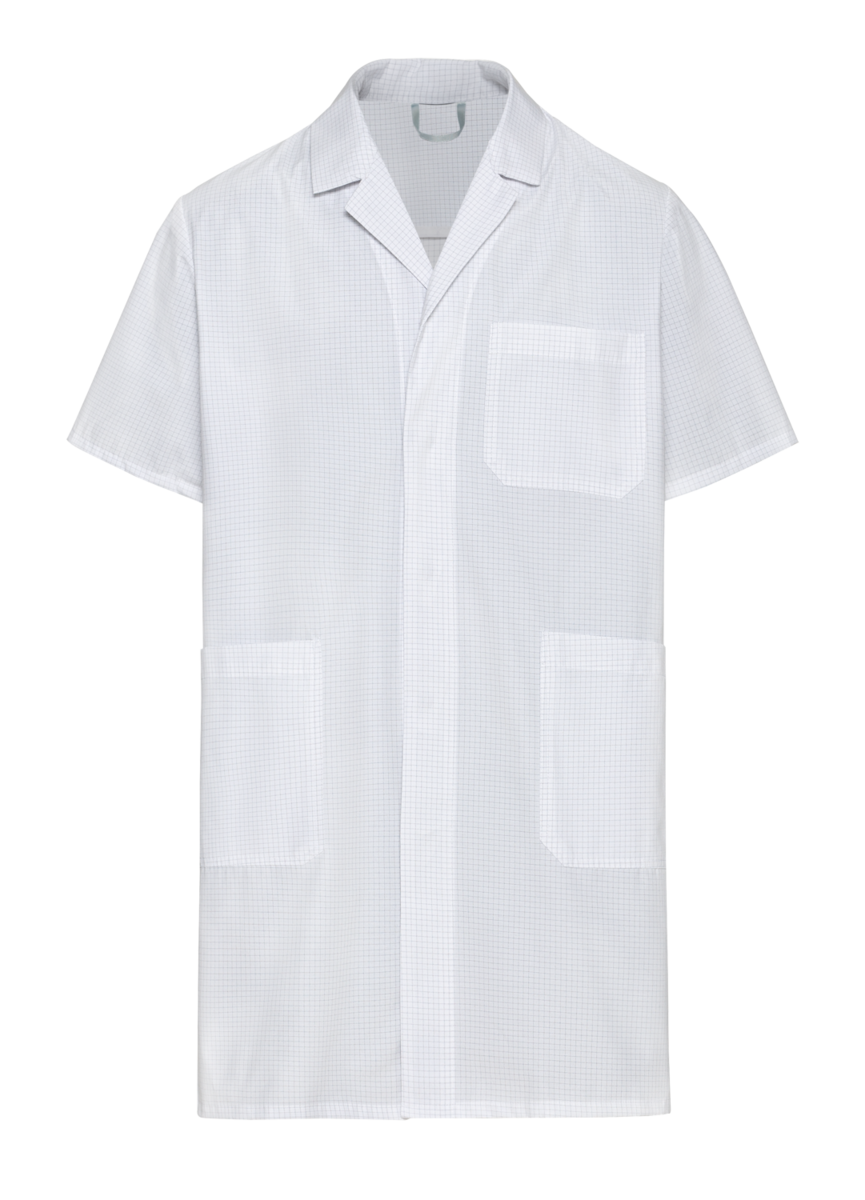 This work coat for men from our ESD Safe Line collection is ideal for staff working with highly sensitive electronic components. Nowadays, electronic components are becoming ever smaller and more sensitive to static electricity, thus requiring reliable protection against electrostatic discharges. Whilst such discharges are usually completely harmless in our day-to-day lives – for example when we receive a small electric shock when shaking hands – electronic components or parts can suffer irreparable damage even at low voltages. In order to prevent that from happening, the Conductex® material used has integrated carbon fibres, which conduct the electrostatic charge in the body away reliably and in a controlled manner without endangering the components. In addition to carbon fibres, Conductex® also contains polyester and cotton. This blend makes the fabric robust, breathable and very comfortable. At just 130 g/m², the work coat also impresses with its light weight. Plus, it can be worn optimally over everyday clothes. Thanks to its long cut, the work coat for men offers protection even during seated work. The men’s coat with short sleeves is available in neutral white. The front closes with concealed press studs. The coat is equipped with one breast pocket and two side pockets. The embroidered EPA logo on the upper left arm indicates the garment’s ESD features clearly.