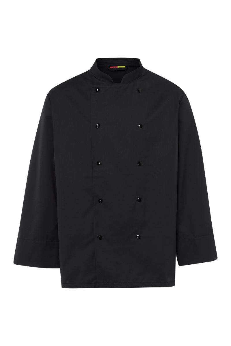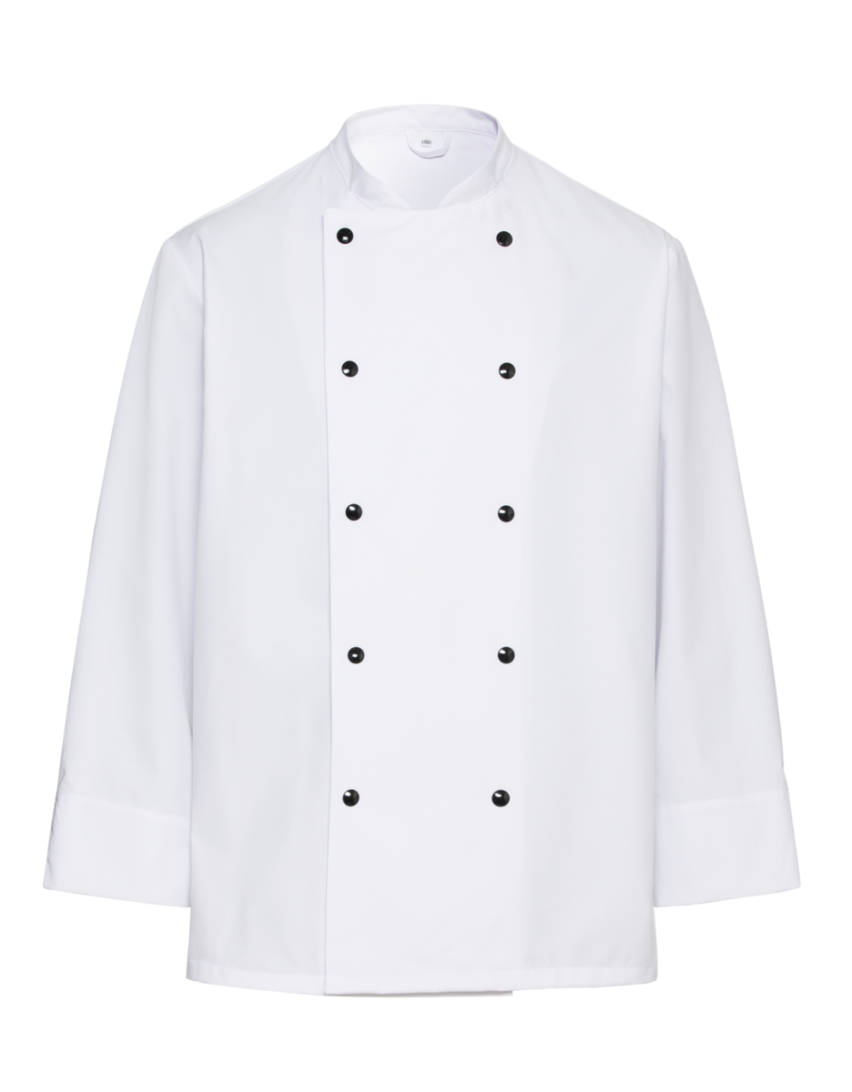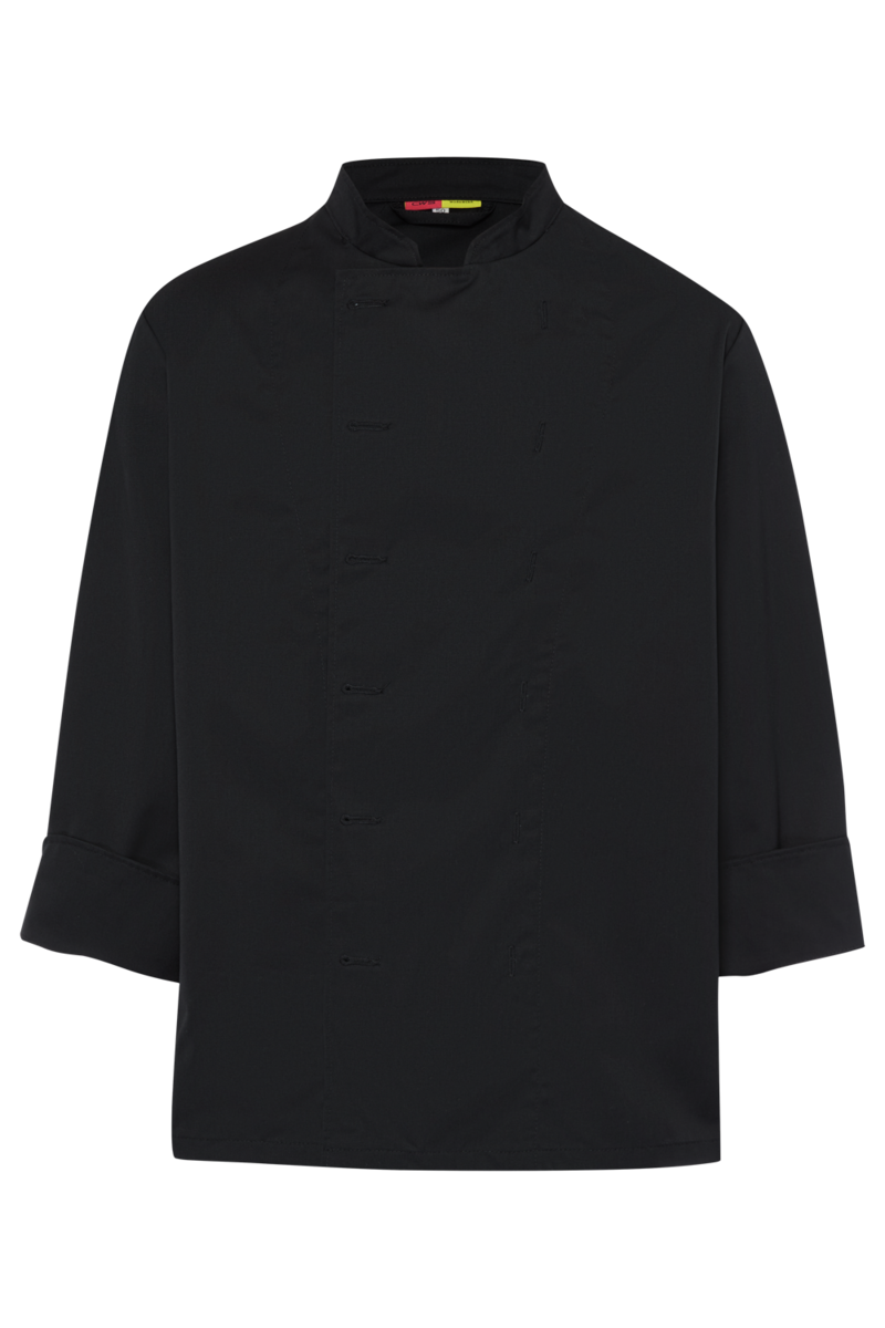 The chef's jacket has a high neck, double-breasted buttons and a discreet stand-up collar. It is closed with a double-breasted button placket. Air-conditioning eyelets under the sleeves improve air circulation. The cuffs have a slit. The chef's jacket has a small breast welt pocket.