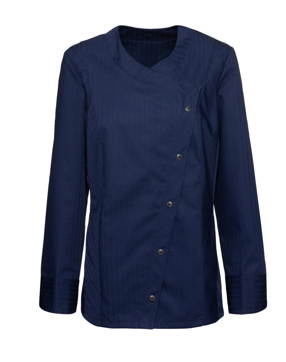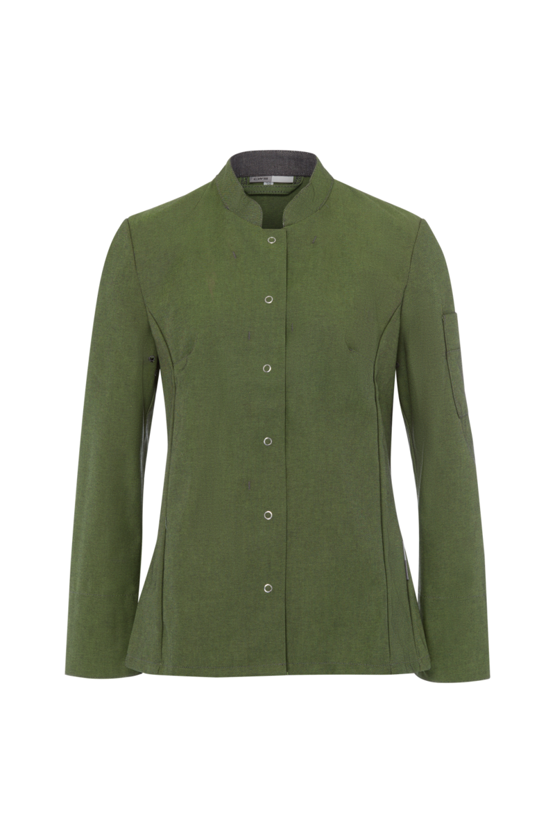 This high-quality chef's jacket from the "Scandic Line" collection by CWS is characterised by its environmentally friendly and resource-saving production. At the same time, practical details support the high wearing comfort and functionality in the hectic everyday kitchen life. The blended fabric made from recycled cotton and recycled polyester is pleasantly light and cool on the skin. The ergonomically shaped sleeves offer optimal freedom of movement; ventilation openings under the arms provide refreshing air circulation in hot and humid kitchens. Parts that are particularly susceptible to dirt, such as the neck area or the arm cuffs, have been finished in a slightly contrasting anthracite. Thanks to the polyester content, this chef's jacket for women is characterised by high colour and shape retention. Due to the high elasticity, the garment creases very little. Both are important arguments for workwear that needs to be changed and cleaned daily. This women's bistro jacket is perfect for all those who attach great importance to pleasant wearing comfort, many well thought-out functions and the use of sustainable materials at work. The chef's jacket closes with press studs that allow the jacket to be taken off quickly in an emergency.