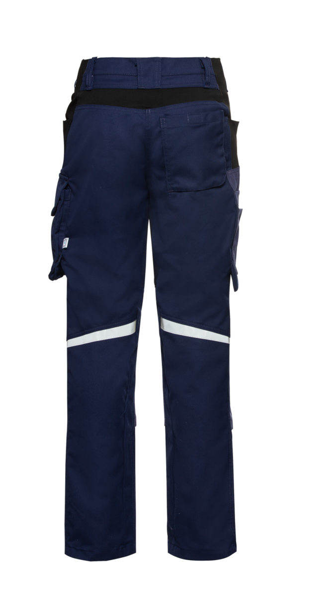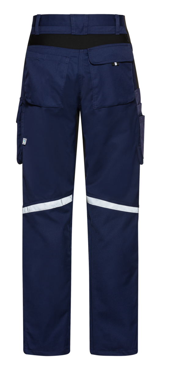W pasie znajdują się szlufki na pasek, ukryte zapięcie na guziki i elastyczna wstawka z boku. Inne szczegóły spodni z paskiem w męskim kroju to ich liczne kieszenie. Mają na przykład dwie kieszenie mieszkowe z tyłu, dwie kieszenie boczne z wkładkami rozciągliwymi Dwa i podwójną kieszeń mieszkową na nogawce ze zintegrowaną kieszenią na smartfona. CWS Workwear wykorzystuje szczególnie wytrzymałą tkaninę CORDURA® na prawą kieszeń na akcesoria i na dołączoną kieszeń na nóż. Taśmy odblaskowe w tylnej części kolan ulepszają widoczność w ciemności.