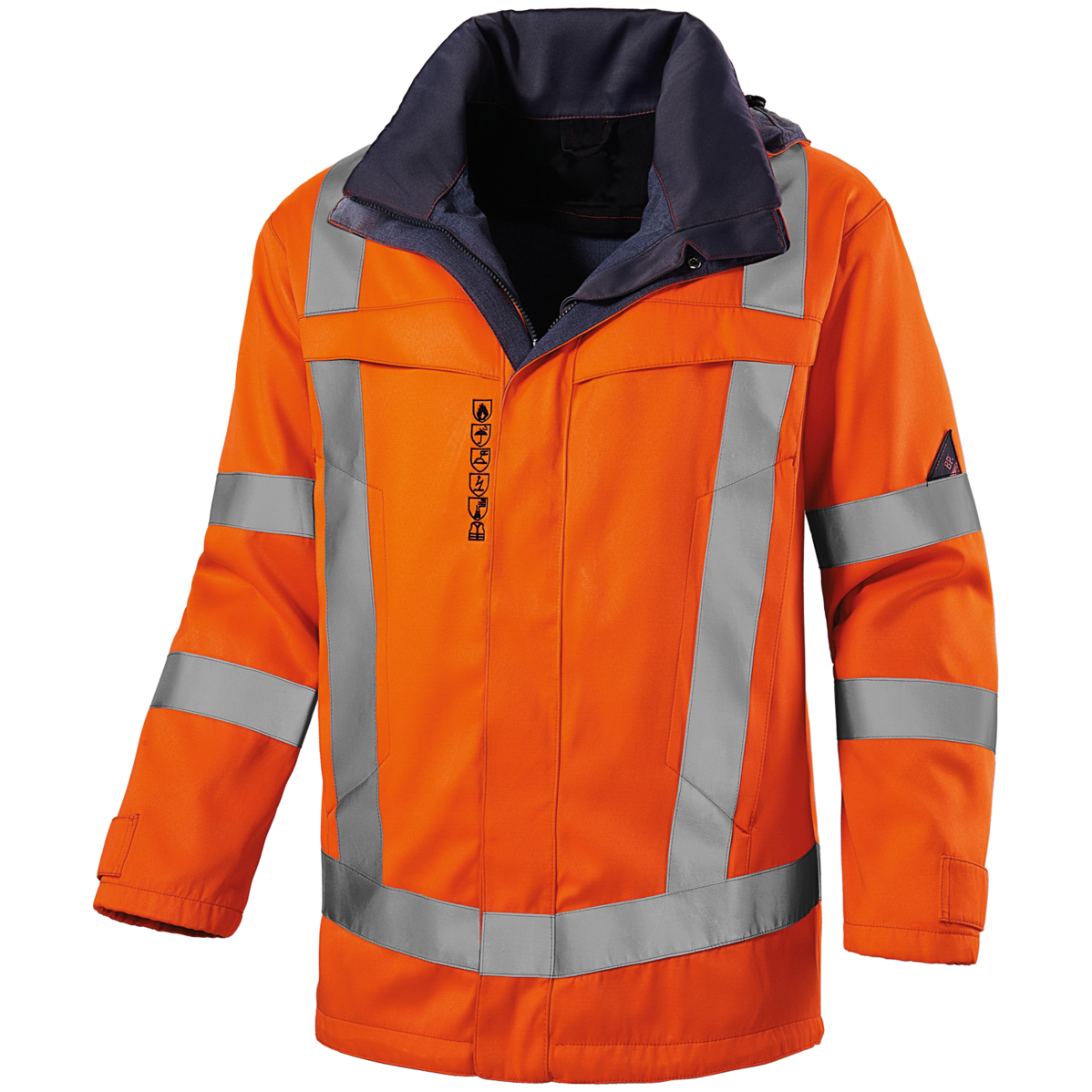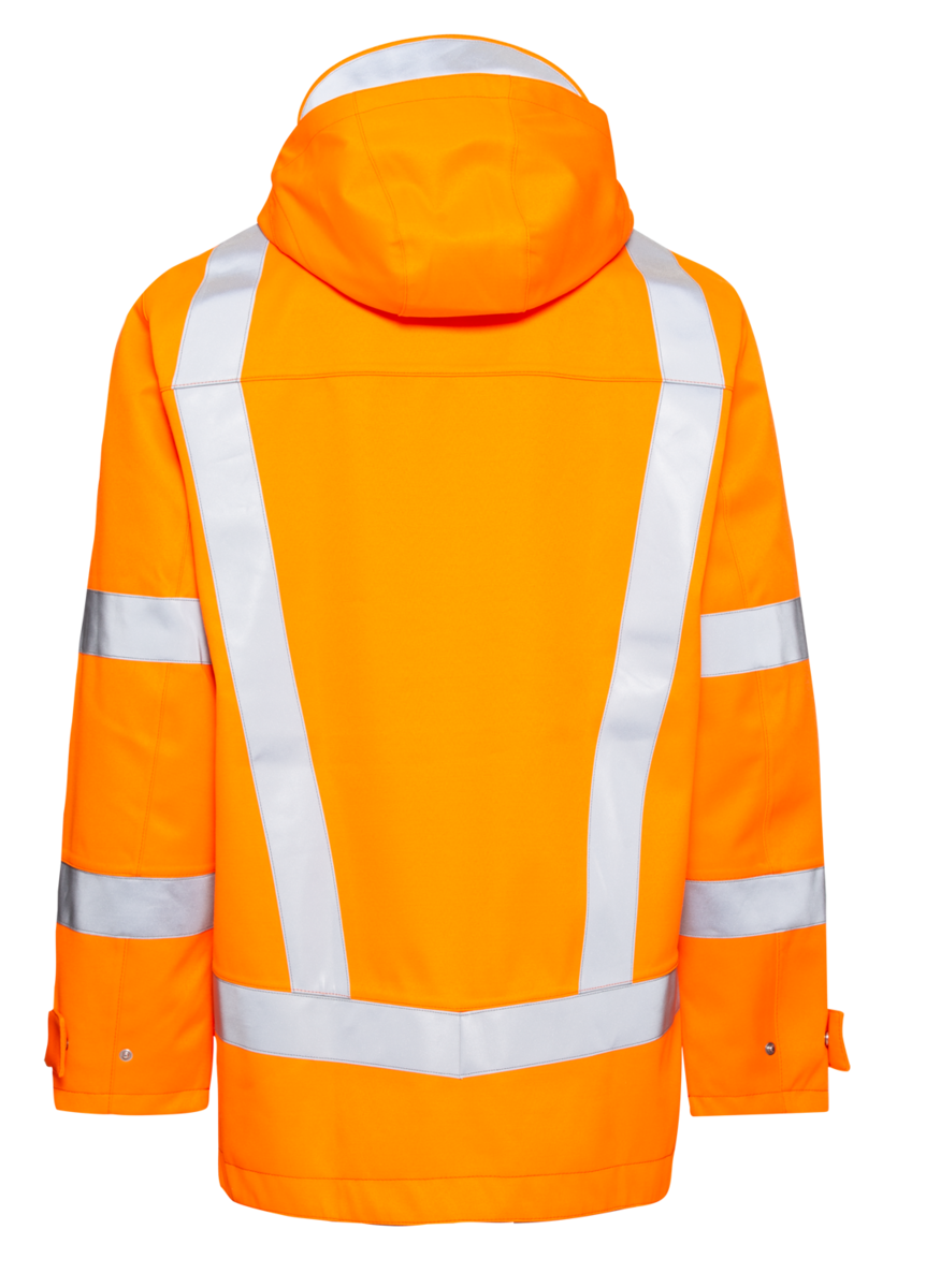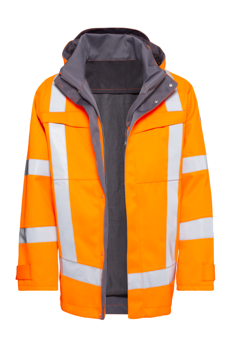The high-visibility parka in this collection is multitalented. With Class 3 high-visibility elements, this parka is designed for employees who transport hazardous goods or who work in the energy sector. Whether in poor weather conditions or in traffic, when vehicles approach at speeds in excess of 60 km/h: the parka in safety orange protects the wearer with its exceptional visibility, due in part to the reflective stripes on the sleeves and above the seam among other points.