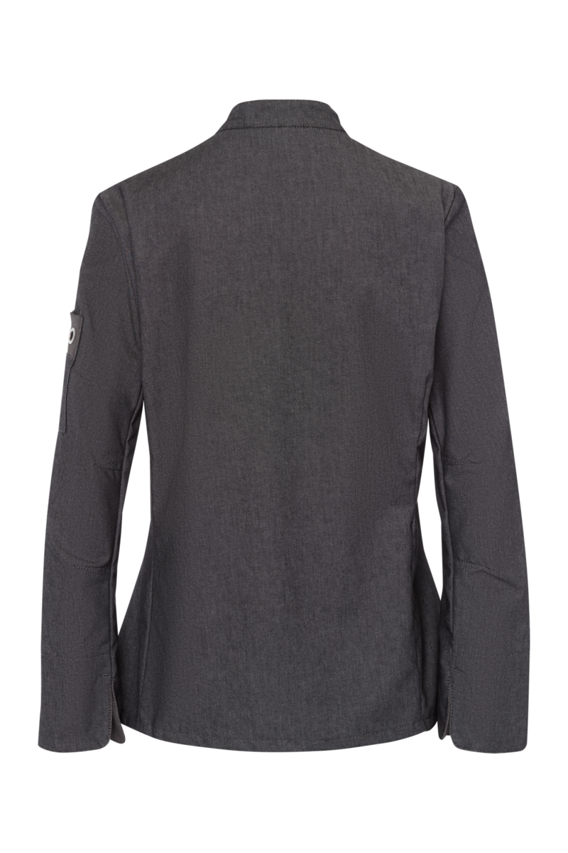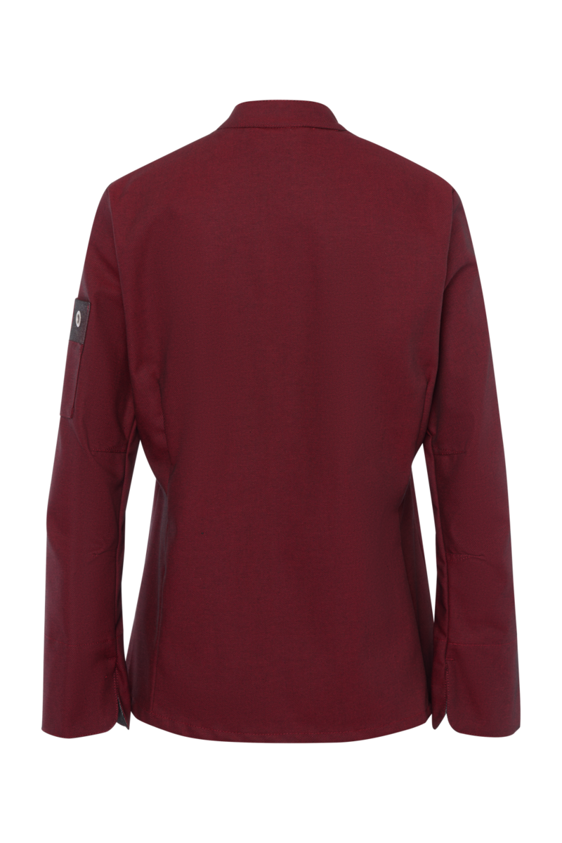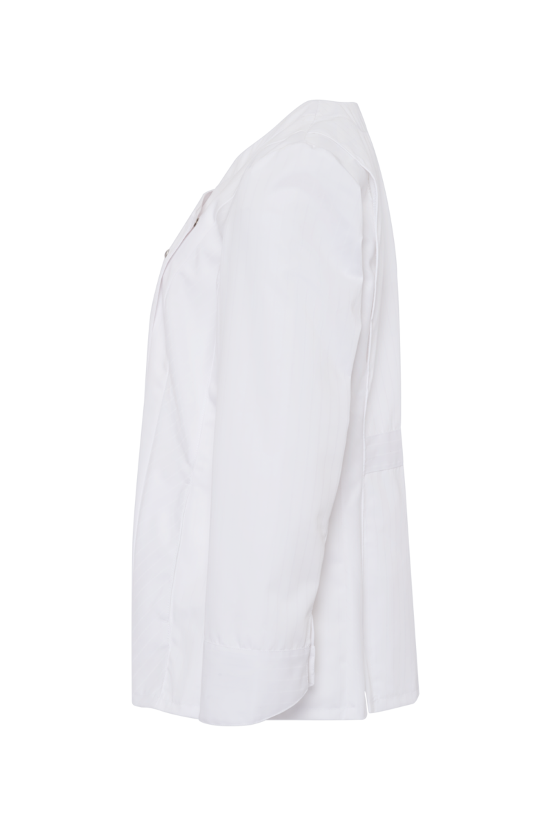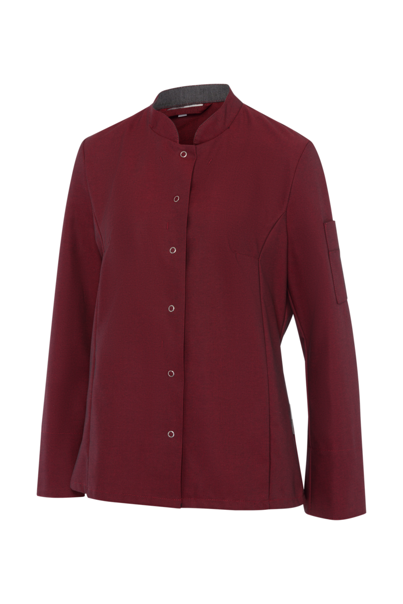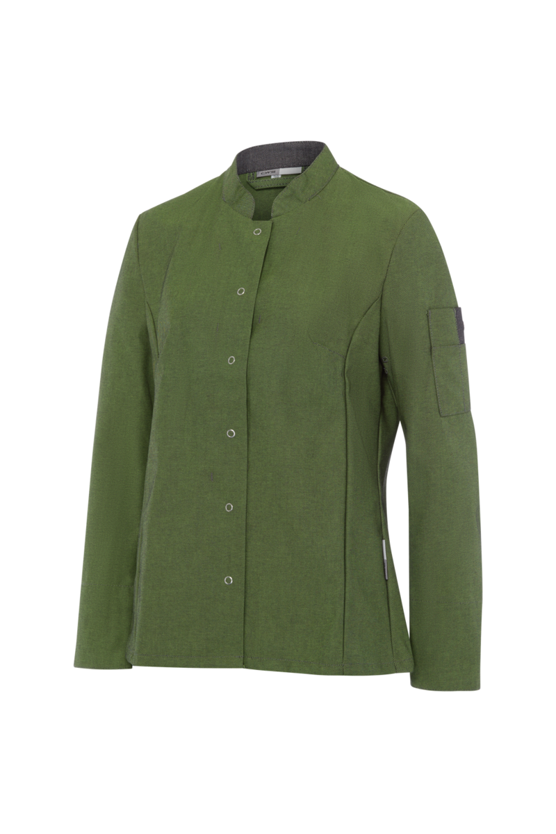 This high-quality chef's jacket from the "Scandic Line" collection by CWS is characterised by its environmentally friendly and resource-saving production. At the same time, practical details support the high wearing comfort and functionality in the hectic everyday kitchen life. The blended fabric made from recycled cotton and recycled polyester is pleasantly light and cool on the skin. The ergonomically shaped sleeves offer optimal freedom of movement; ventilation openings under the arms provide refreshing air circulation in hot and humid kitchens. Parts that are particularly susceptible to dirt, such as the neck area or the arm cuffs, have been finished in a slightly contrasting anthracite. Thanks to the polyester content, this chef's jacket for women is characterised by high colour and shape retention. Due to the high elasticity, the garment creases very little. Both are important arguments for workwear that needs to be changed and cleaned daily. This women's bistro jacket is perfect for all those who attach great importance to pleasant wearing comfort, many well thought-out functions and the use of sustainable materials at work. The chef's jacket closes with press studs that allow the jacket to be taken off quickly in an emergency.