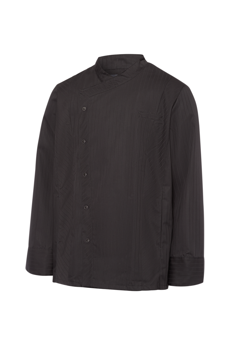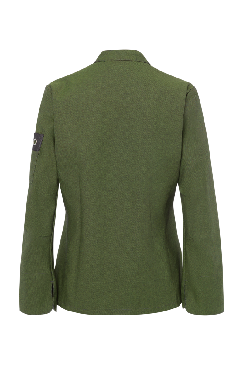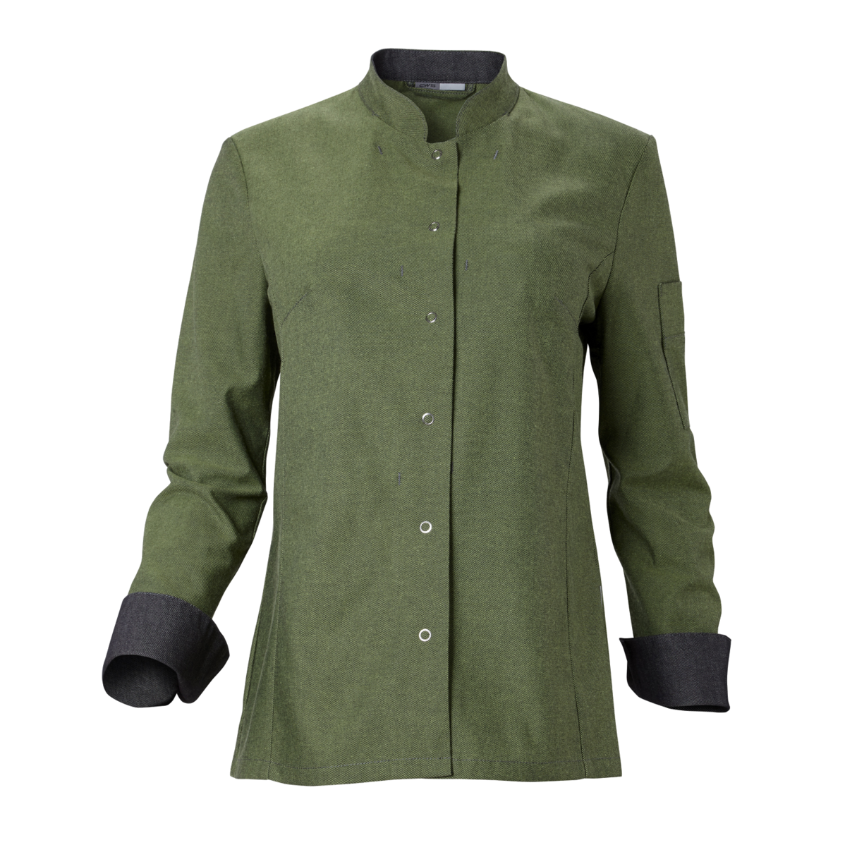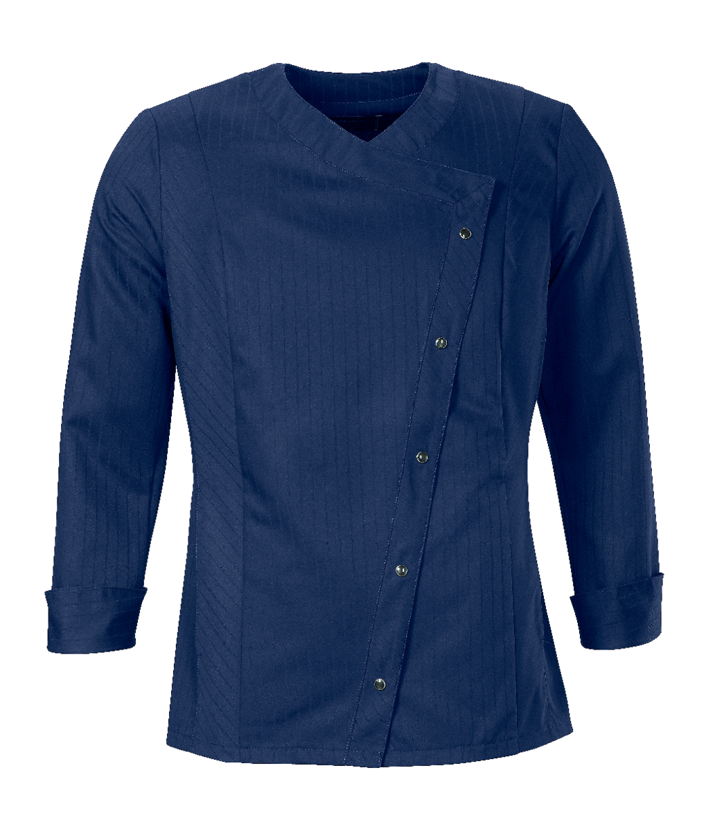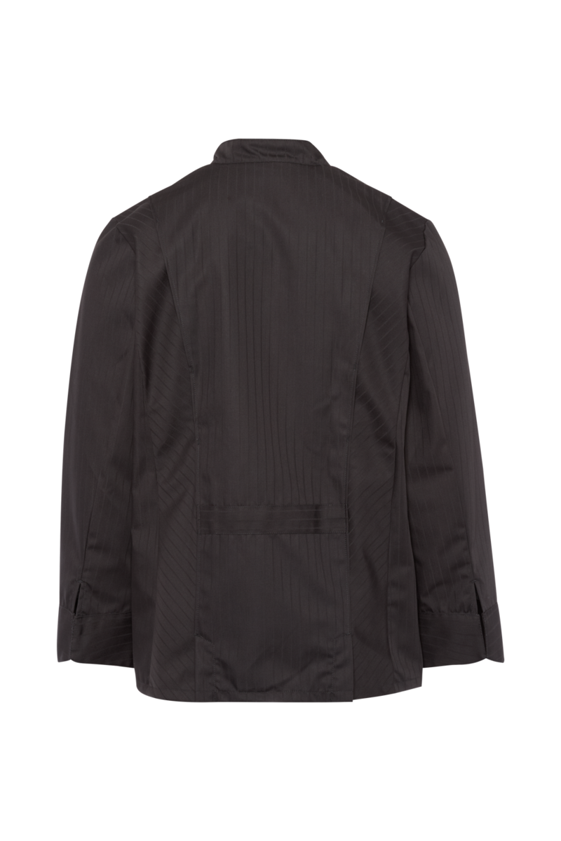 This high-quality chef's jacket from the "Scandic Line" collection by CWS is characterised by its environmentally friendly and resource-saving production. At the same time, practical details support the high wearing comfort and functionality in the hectic everyday kitchen life. The blended fabric made from recycled cotton and recycled polyester is pleasantly light and cool on the skin. The ergonomically shaped sleeves offer optimal freedom of movement; ventilation openings under the arms provide refreshing air circulation in hot and humid kitchens. Parts that are particularly susceptible to dirt, such as the neck area or the arm cuffs, have been finished in a slightly contrasting anthracite. Thanks to the polyester content, this chef's jacket for women is characterised by high colour and shape retention. Due to the high elasticity, the garment creases very little. Both are important arguments for workwear that needs to be changed and cleaned daily. This women's bistro jacket is perfect for all those who attach great importance to pleasant wearing comfort, many well thought-out functions and the use of sustainable materials at work. The chef's jacket closes with press studs that allow the jacket to be taken off quickly in an emergency.