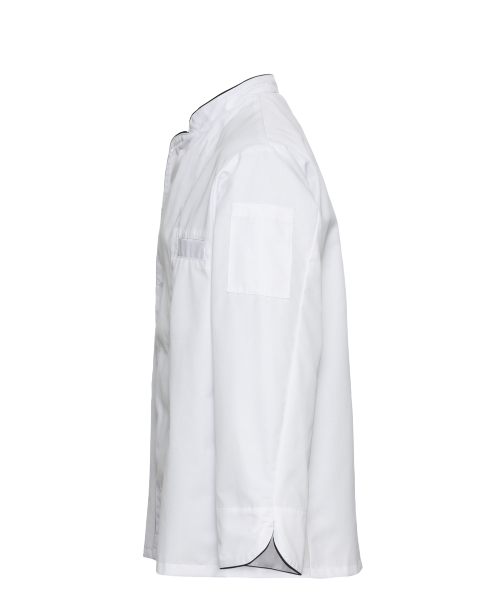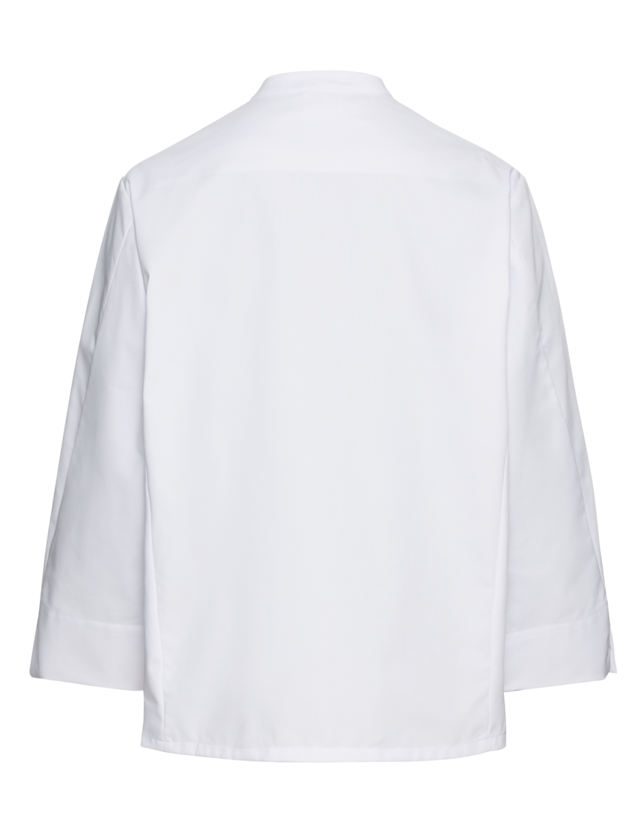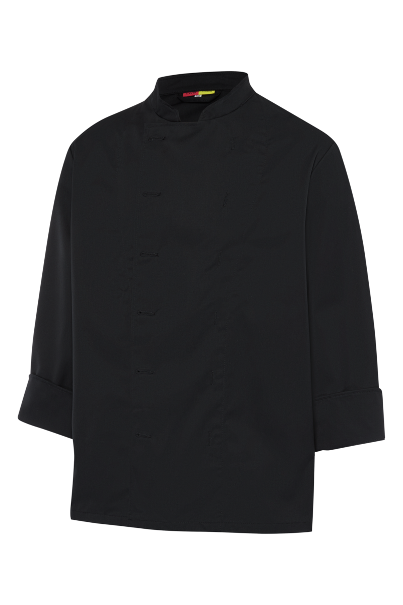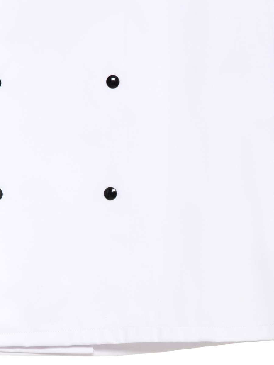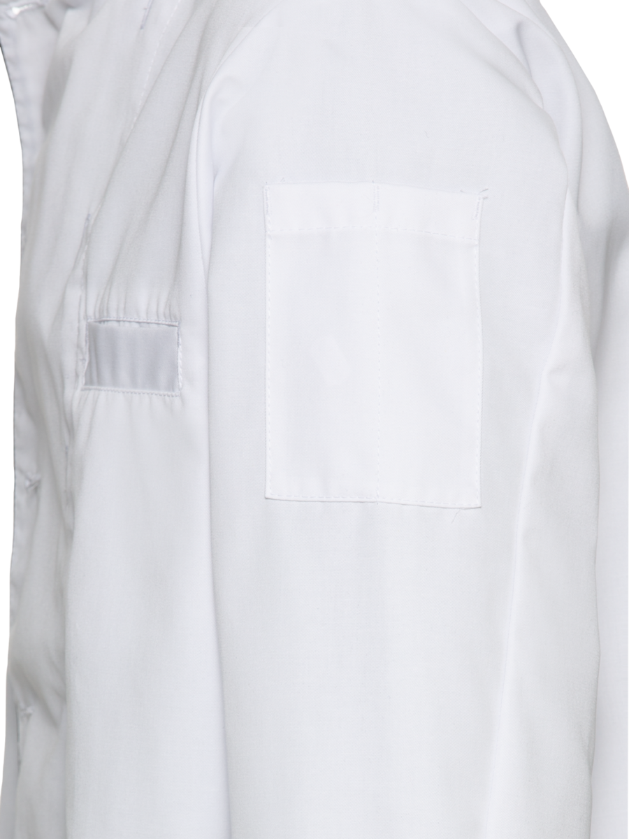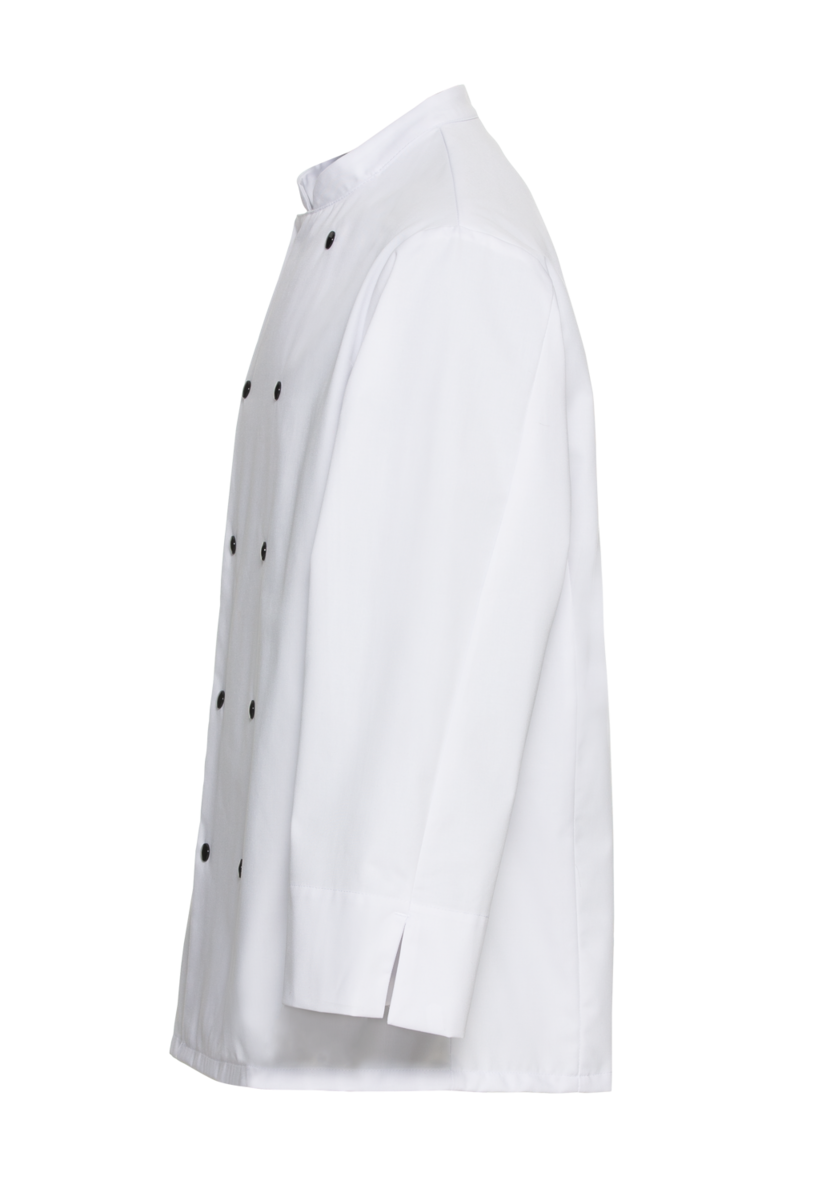 The chef's jacket has a high neck, double-breasted buttons and a discreet stand-up collar. It is closed with a double-breasted button placket. Air-conditioning eyelets under the sleeves improve air circulation. The cuffs have a slit. The chef's jacket has a small breast welt pocket.