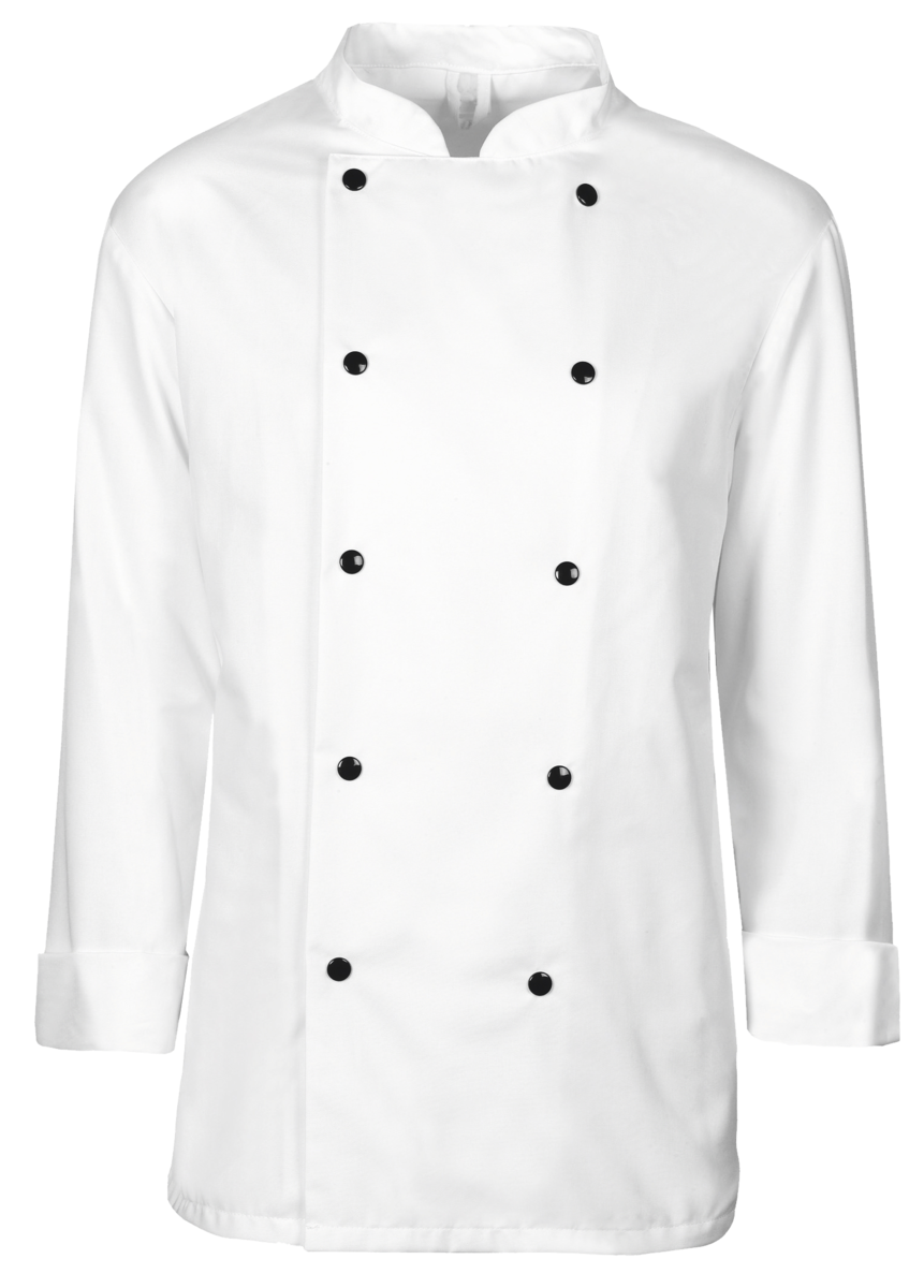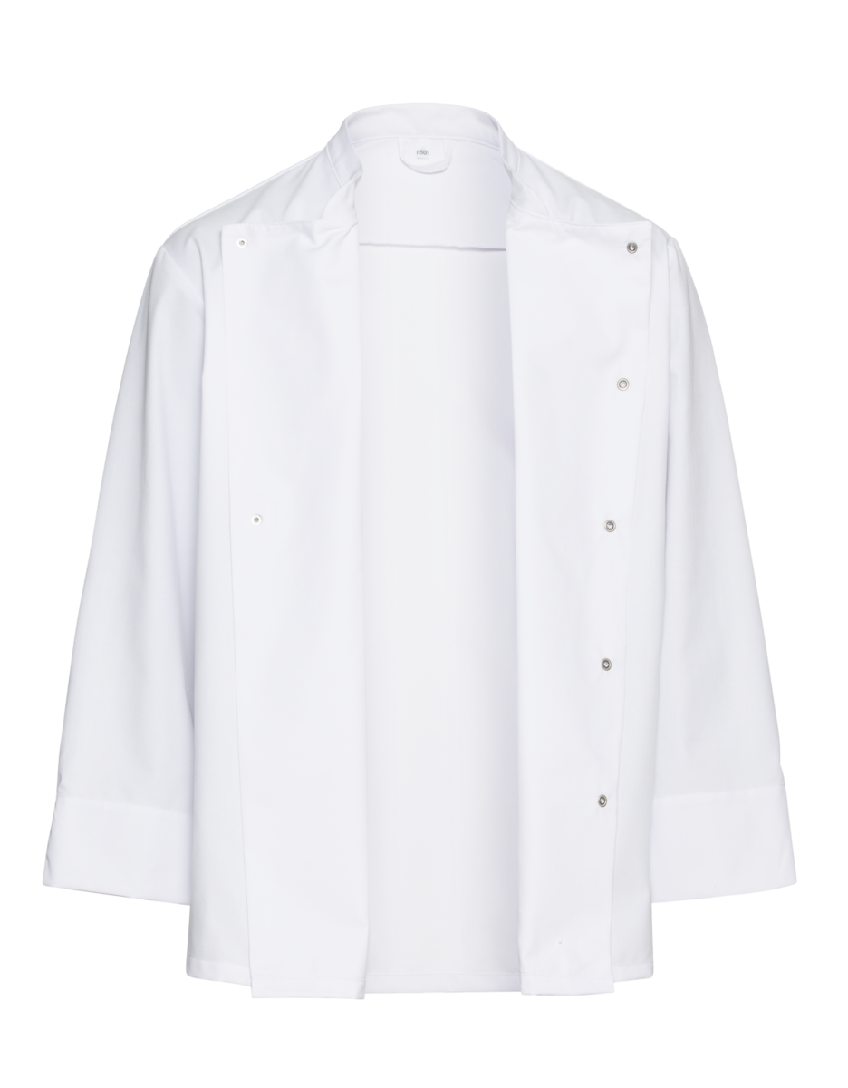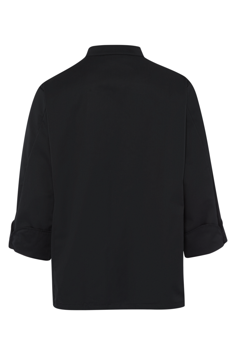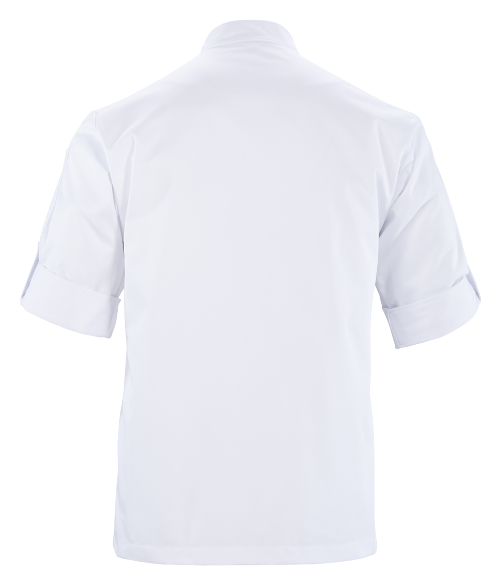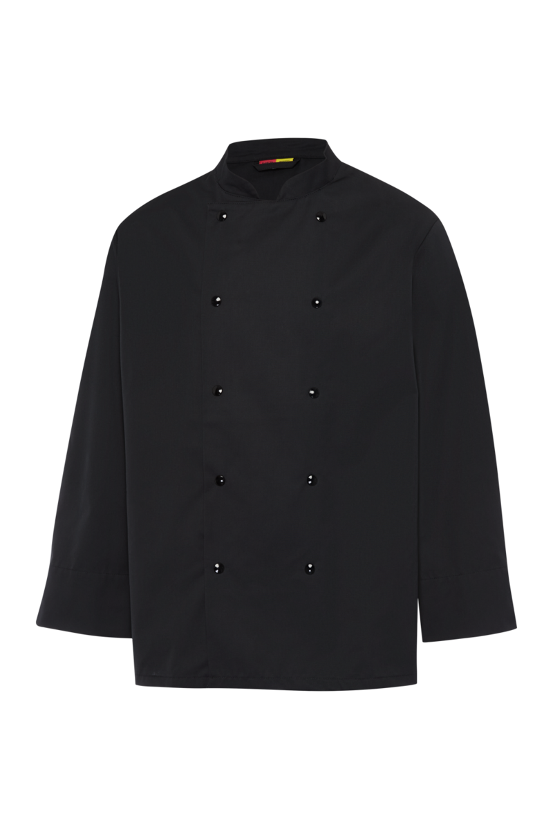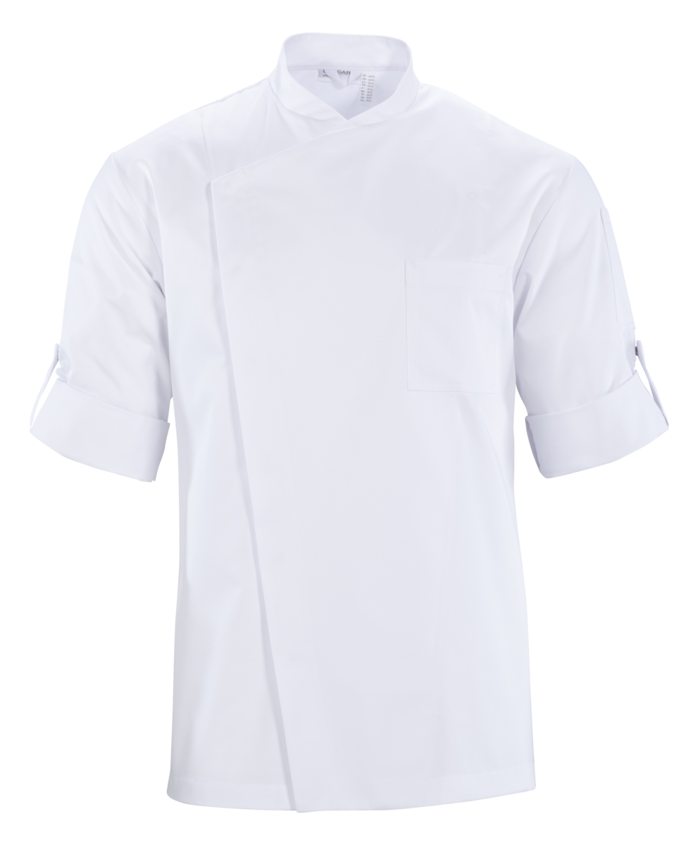 The chef's jacket has a high neck, double-breasted buttons and a discreet stand-up collar. It is closed with a double-breasted button placket. Air-conditioning eyelets under the sleeves improve air circulation. The cuffs have a slit. The chef's jacket has a small breast welt pocket.